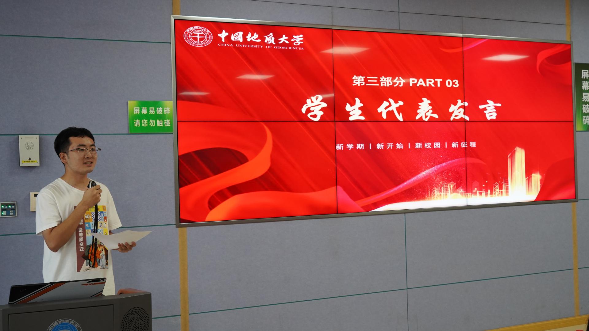 第十六期“李四光计划”班长陈楷夫作为学生代表发言。他感谢学校提供宝贵的学习资源和平台。他表示,一定珍惜在“李四光计划”学习的机会,将来力争成为有责任担当、有扎实学识的科研工作者。
