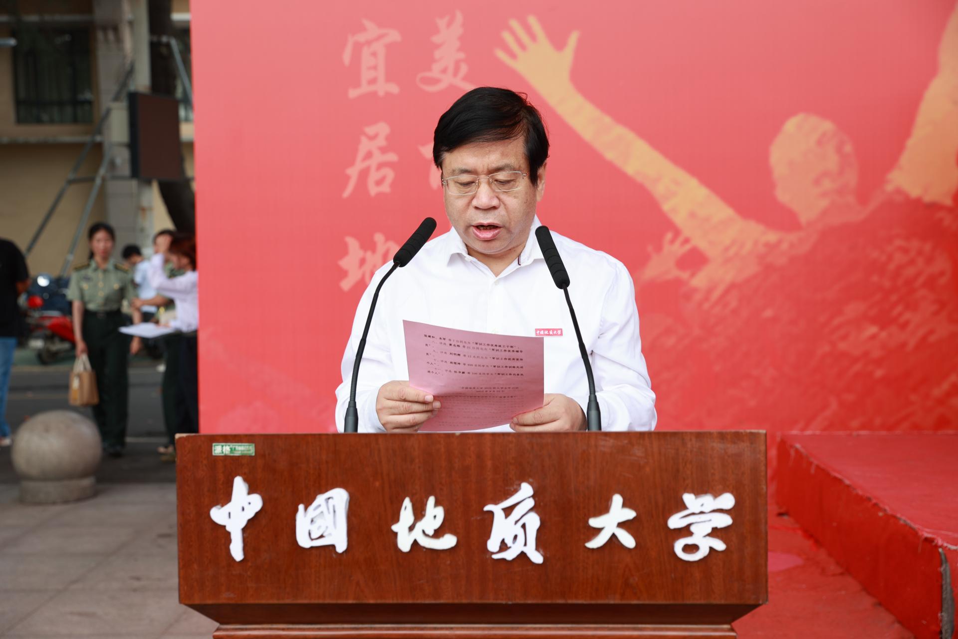 校长王焰新院士作了题为《锤炼本领 迎接挑战》的讲话。他说,在全校上下喜迎党的二十大,同心欢庆建校70周年之际,4717名新“CUGERS”以饱满的精神状态、铿锵有力的步伐和富有创意的青春告白提交了大学第一堂爱国实践课的答卷。