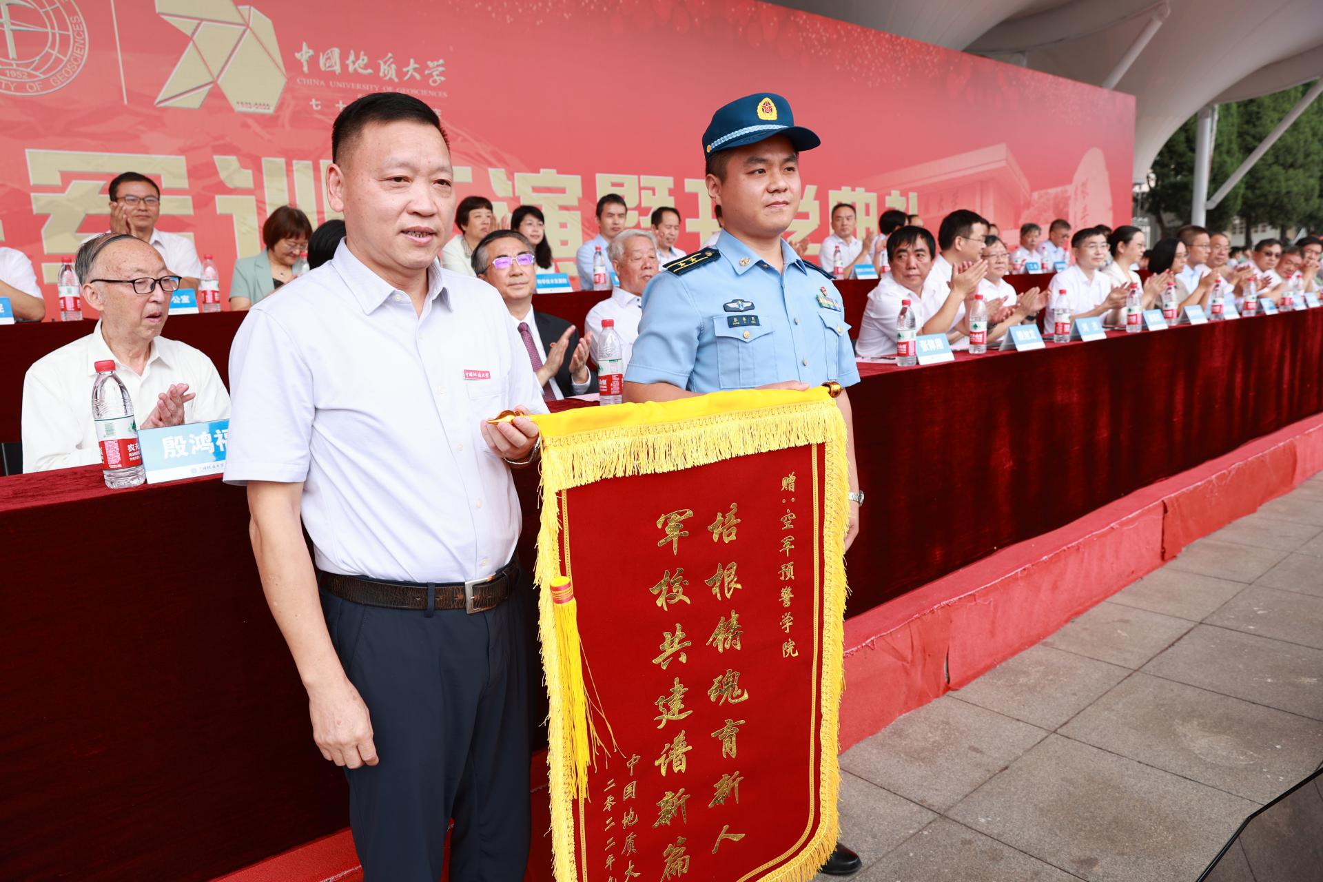 校党委副书记王林清向2022年新生军训承训单位空军预警学院赠送锦旗。