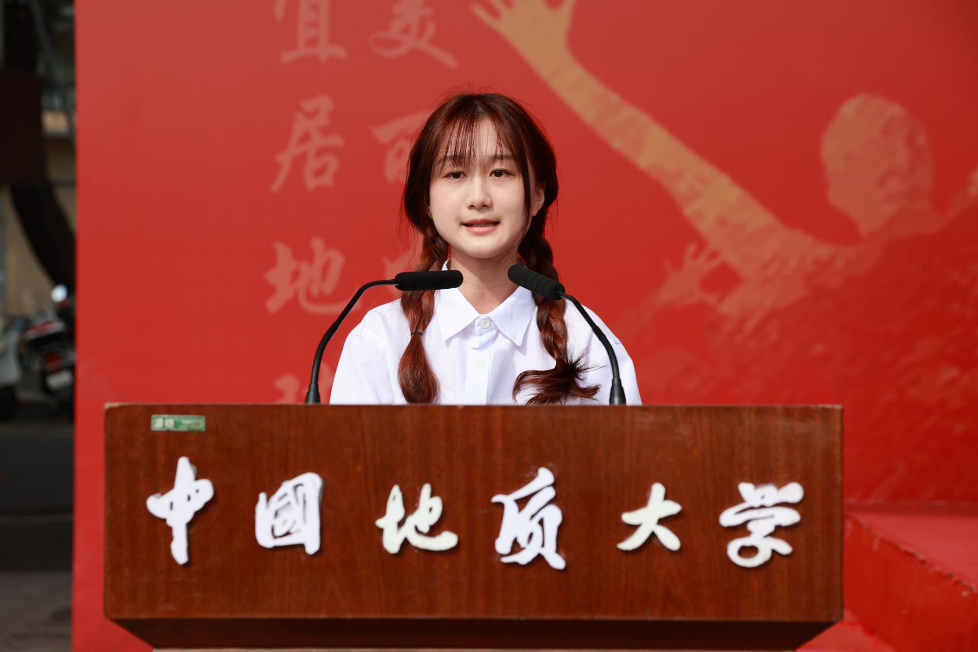 新生代表、珠宝学院吴传莹分享了爷爷和爸爸等老一辈地质人的故事。她表示,作为家中第三代地大人,希望和同学们一起,传承地质的精神和荣光,以青春之我,书写青春之人生、青春之时光、青春之未来。