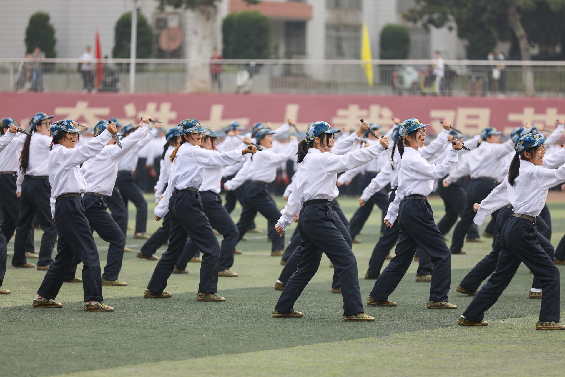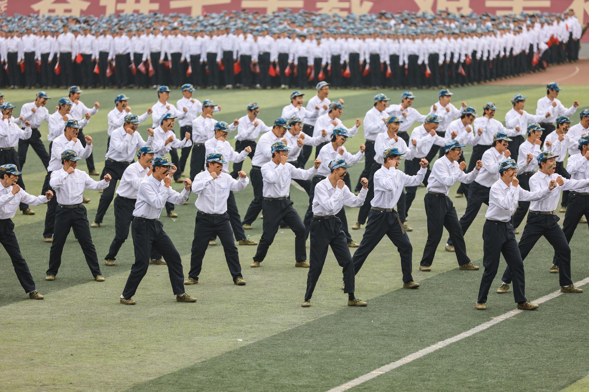 “秦时明月汉时关,万里长征人未还,但使龙城飞将在,不教胡马度阴山”,擒敌拳方阵由200名男生组成,他们一边喊着口号,一边展示拳法,一招一式,铿锵有力,令人热血沸腾。