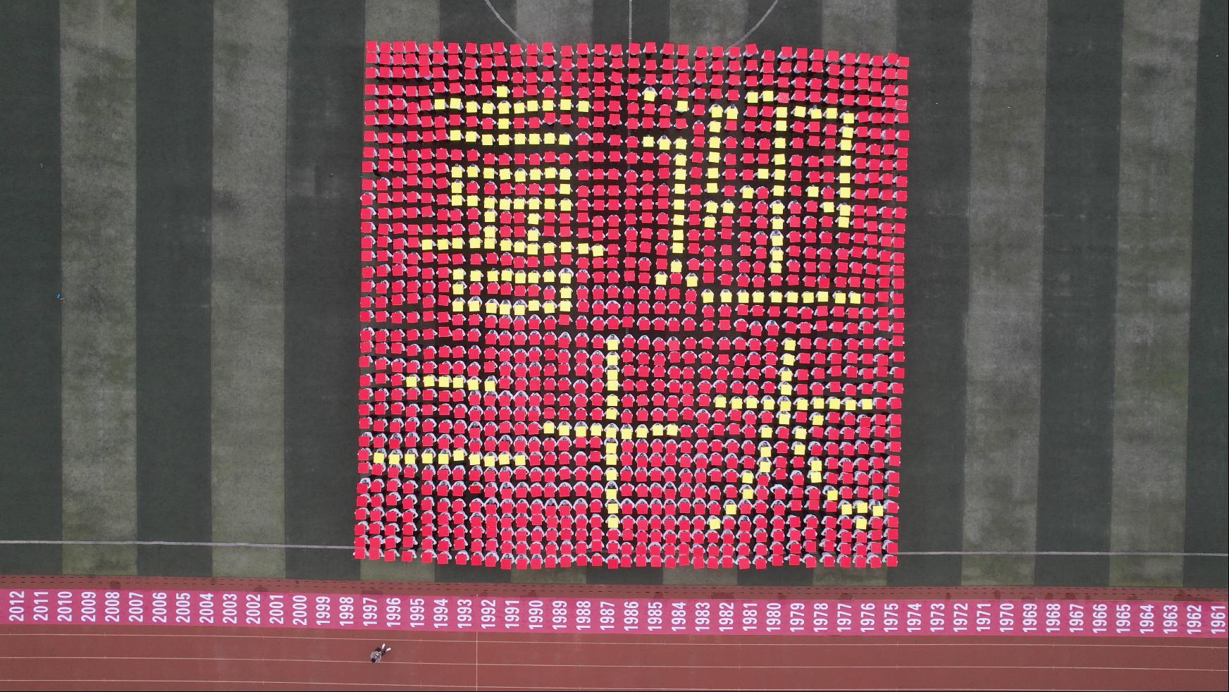 校庆方阵由工程学院、经济管理学院、计算机学院以及珠宝学院的1225名新生组成。他们手持红黄两色纸板,通过颜色和动作改变,变换出“喜迎二十大”“奋进新征程”“永远跟党走”“请党放心,强国有我”“美丽中国,宜居地球”“七十”“CUG”“艰苦朴素,求真务实”“七秩荣光,逐梦未来”等字样,迎接党的二十大,共祝地大70周年华诞。