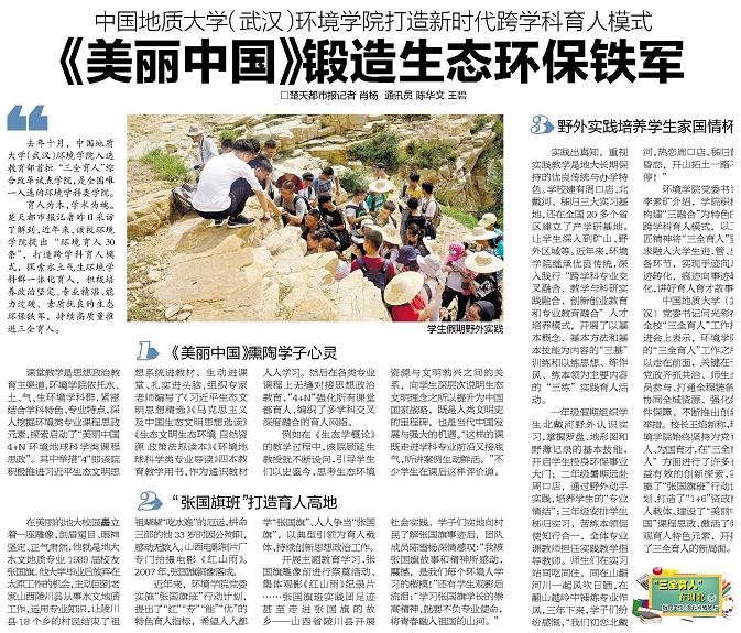 地大新闻网讯 环境学院是我国最早开展水文地质专业高层次人才培养的学院,是湖北省第一个设立环境工程博士点、华中地区唯一设立大气科学本科专业的学院,具有本—硕—博完整人才培养体系和水—土—气—生—环学科专业育人体系。环境学院党委紧紧围绕立德树人根本任务,坚持为党育人、为国育才,把“五个到位”“七个有力”作为党建质量标准,把“干在实处、走在前列”作为改革发展的座右铭。以“党建领院、以史铭院、学术立院、特色建院、人才强院、文化兴院、开放活院、依法治院”作为办学治院理念,深入推进党建思政工作提质增效,引领学院高质量内涵发展。环境学院先后入选湖北省高校试点改革学院(2017)、教育部首批“三全育人”综合改革试点学院(2018)、第二批全国党建工作标杆院系(2019)、党建成果“注入红色基因铸魂育人”入选2019—2020湖北十大党建案例、“张国旗班”党支部入选第三批“全国党建工作样板支部”(2022)。办学七十年来,环境学院走出了2万余名优秀毕业生,有两院院士、“鸟巢”和“冰丝带”总工程师,有著名登山健将,还有时代楷模。他们奔赴祖国各地,在生态环保领域为祖国建设发展添砖加瓦,用奋斗书写环境人绚丽人生。