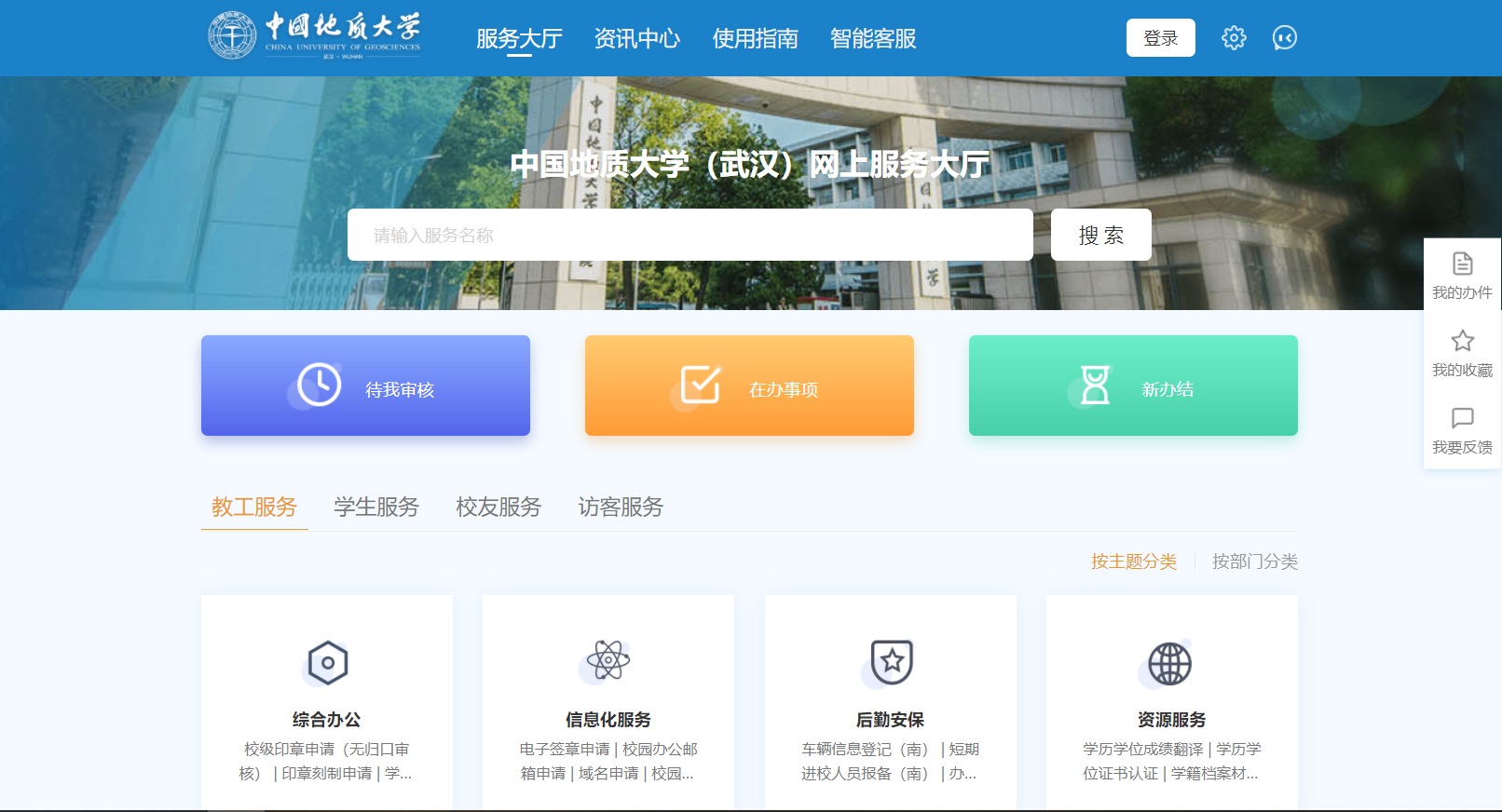 学校信息化建设中,梳理和优化业务流程,深化服务大厅建设,按照随时可办、一网通办、一次办结、应上尽上的建设思路,推动各类师生服务汇聚到学校统一的网上服务大厅,所有的线下服务集中到线下服务大厅办理,采取“线上约、网上办,一网通办;南望厅、未来厅,两厅同办”服务方式,将网络端、移动端、实体端三大场景深度融合,形成“一网两厅”统一管理的服务体系,做到校园服务全覆盖、社会服务关联办。目前网上厅提供提供11大类、42个子类共计148项一站式办理服务。