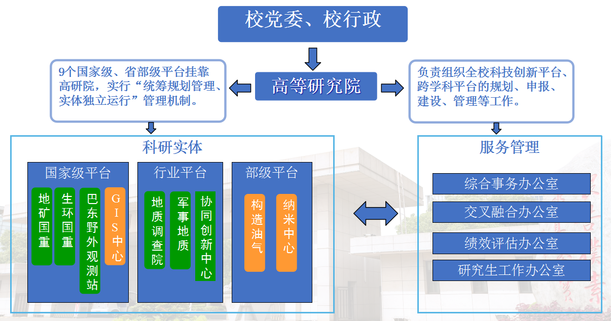 高研院统筹负责党建、思政、人事、大型仪器设备共享、研究生管理、群团工作等非学术事务管理工作。各科技平台独立运行,由知名学者担任各平台负责人。高研院以科技创新驱动经济高质量发展为主线,面向国家重大需求、围绕学校“美丽中国、宜居地球”战略和“双一流”建设目标,推动以地球科学为牵引的交叉融合,加强地球系统科学原创性科技创新,将高等研究院建成学科交叉融合的科技创新先导区,跨学科研究、拔尖创新人才培养、国际合作与交流的示范区,国家核心战略科技力量的重要支柱,有力服务地球科学领域世界一流大学的建设。