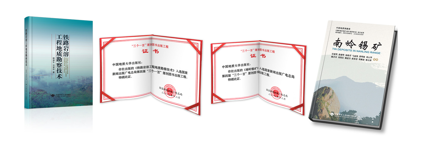 经过多年深耕学术沃土、合理科学谋划,出版社在学术著作出版板块取得了丰硕的成果,品牌效益凸显。《中国大陆科学钻探主孔0~200m地球物理测井》《中国西部自然资源竞争力评估研究》入选国家首届“三个一百”原创图书;《长江中游洪灾形成于防治的环境地质研究》《矿产资源可持续力》入选第三届“三个一百”原创图书出版工程;《铁路岩溶工程地质勘察技术》《南岭锡矿》入选第四届“三个一百”原创图书出版工程;《中国典型城市环境地质图集》获第六届中华优秀出版物奖、2016年优秀地图作品裴秀奖铜奖;《天然气水合物的勘探和开发》获得湖北省图书奖提名奖;《长江三峡水利枢纽工程地质勘察与研究(上、下册)》获第二届湖北出版政府奖;《中国重要经济区和城市群地质环境图集》获第三届湖北出版政府奖、2016年优秀地图作品裴秀奖银奖;《南海西科1井碳酸盐岩生物礁储层沉积学(4册)》获第四届湖北出版政府奖;《中国黄河中上游流域自然资源图集》等9项图书出版项目获得国家出版基金资助;《长江经济带生态地质和环境修复》等6个图书项目入选“十四五”时期国家重点图书出版专项规划,出版社社会影响力进一步提升。