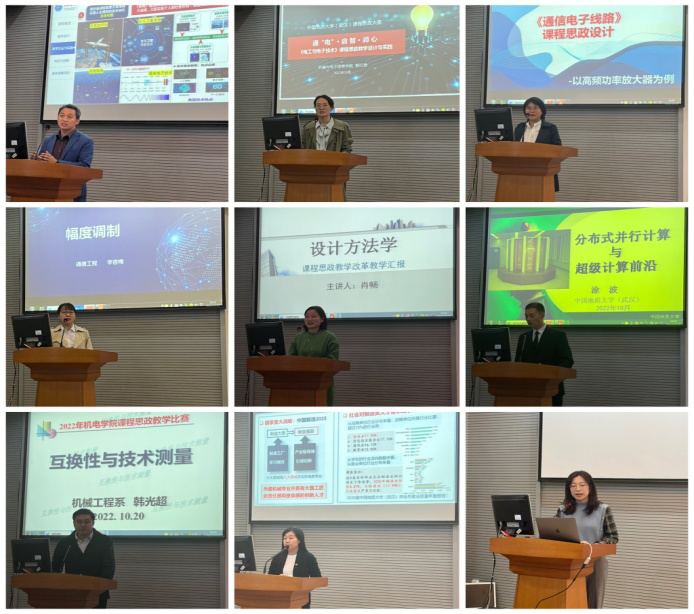 比赛中,9位参赛教师各施所长,倾情讲解。他们结合所授课程或所在教学团队,根据自身的教学经验,从不同的角度将思政内容切入专业知识点。有的老师提出“三五三”教学模式,强调重塑课程,令人眼前一亮;有的老师指出要注重知行合一,注重理论与实践相结合,将教育教学落到实处;有的老师提出要拓宽思政内容的广度,致力于让思政内容更生动、更容易被接受;有的老师将课程典型案例与时事政策、国家安全相结合,因时而动,寻找学生的共情点,激发学生的责任感与使命感;有的老师提出要把中国传统文化融于课堂,打造多维度课堂和有温度课堂,实现思政教育与专业课程相融合。参赛教师们各展风采,各具特色。