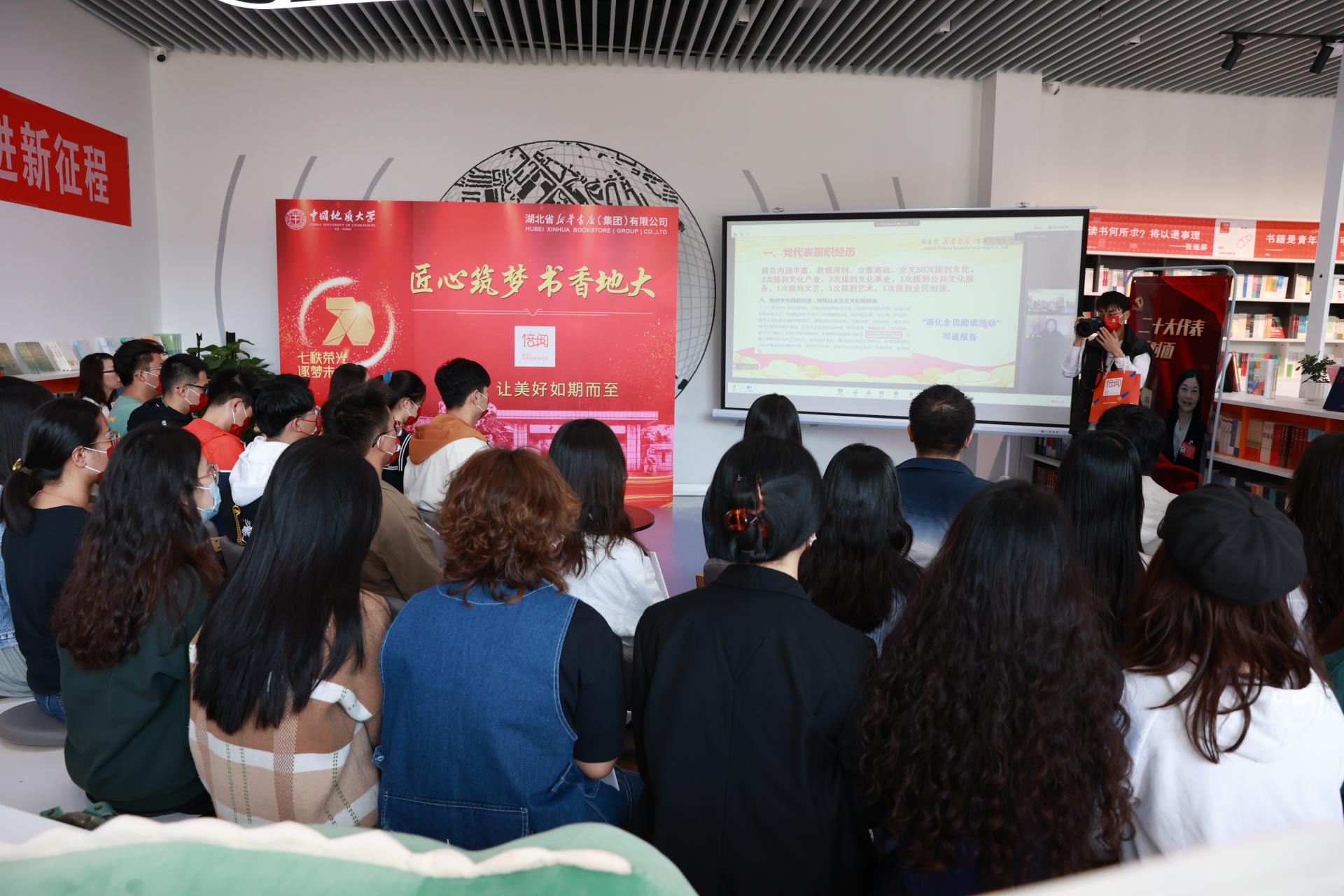 揭牌仪式后,党的二十大代表、湖北省新华书店(集团)有限公司武汉市分公司党支部书记、经理周怡与青年学生们线上面对面交流学习。