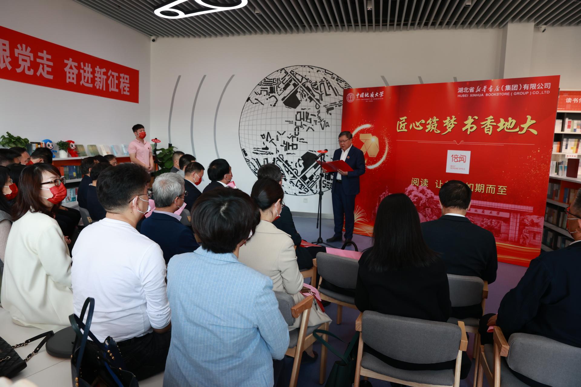 储祖旺主持揭牌仪式。他表示,倍阅·未来城书店是湖北省新华书店与学校合作共同打造的、兼具文化服务和产业经营双重属性的高校校园书店,是推进书香校园建设、助力全民阅读的一项重要举措,能为师生提供阅读、交流、学习、实践、展示等一站式新体验。
