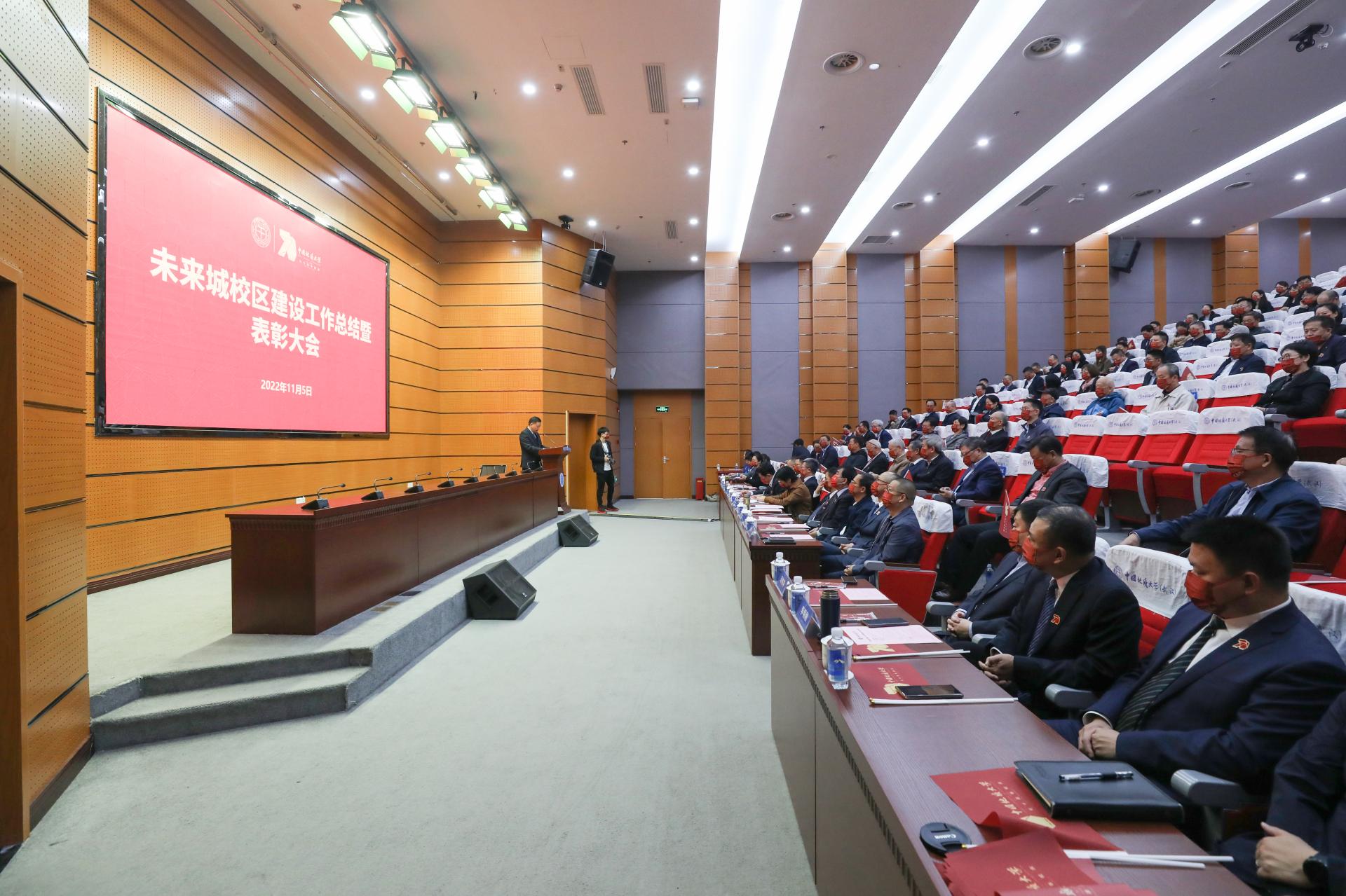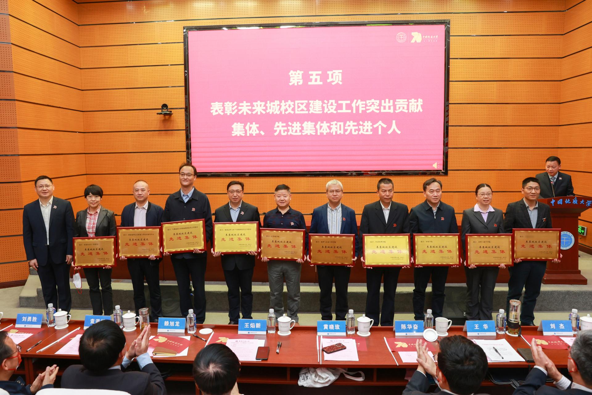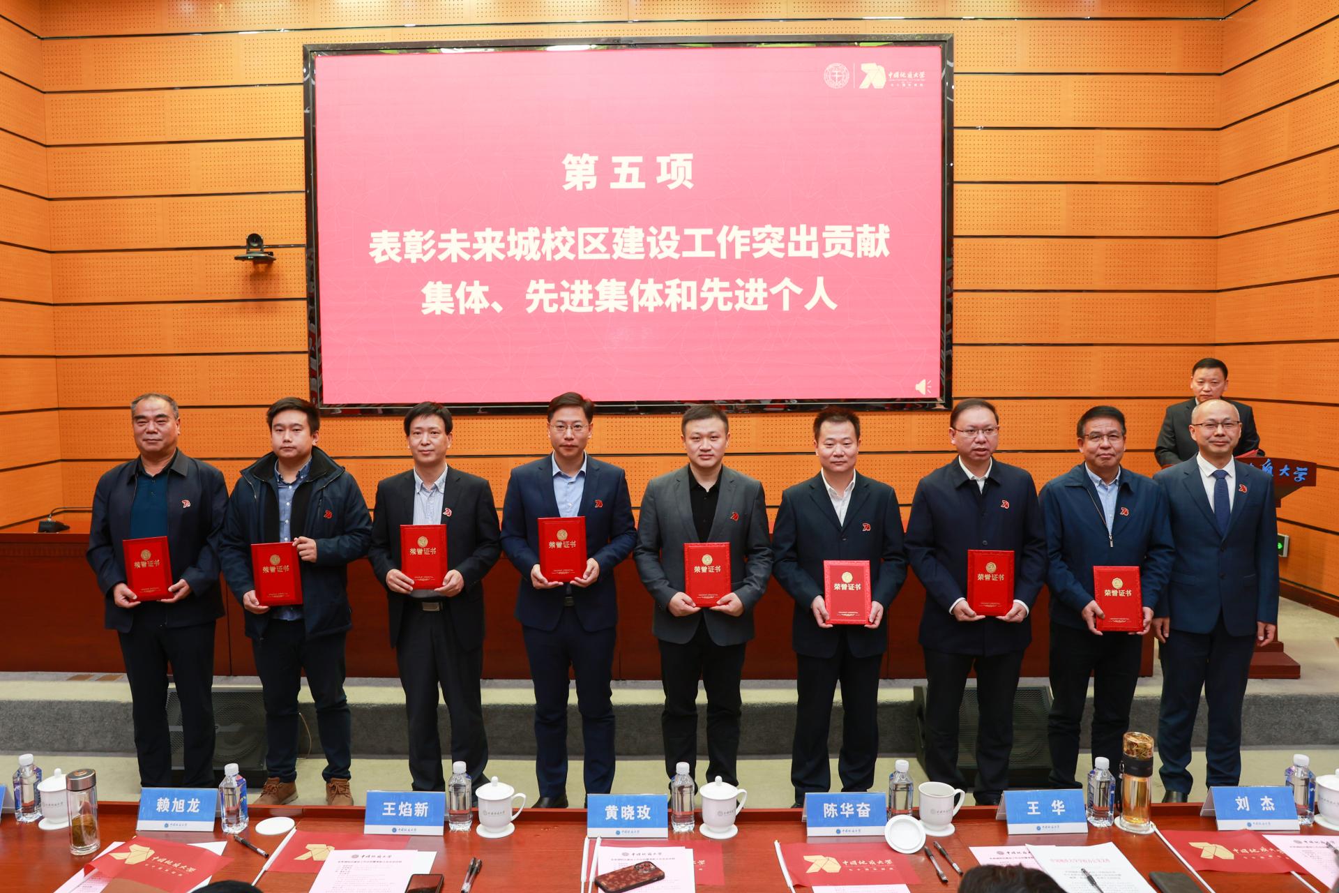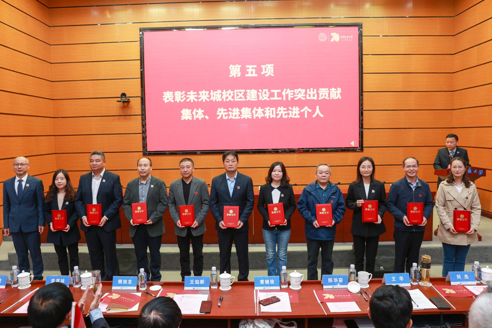 副校长王华宣读《关于表彰未来城校区建设工作突出贡献集体、先进集体、先进个人的决定》。新校区建设指挥部获评“突出贡献奖”,材料与化学学院等16个二级单位获评“先进集体”,于荣萍等105名同志获评“先进个人”。
