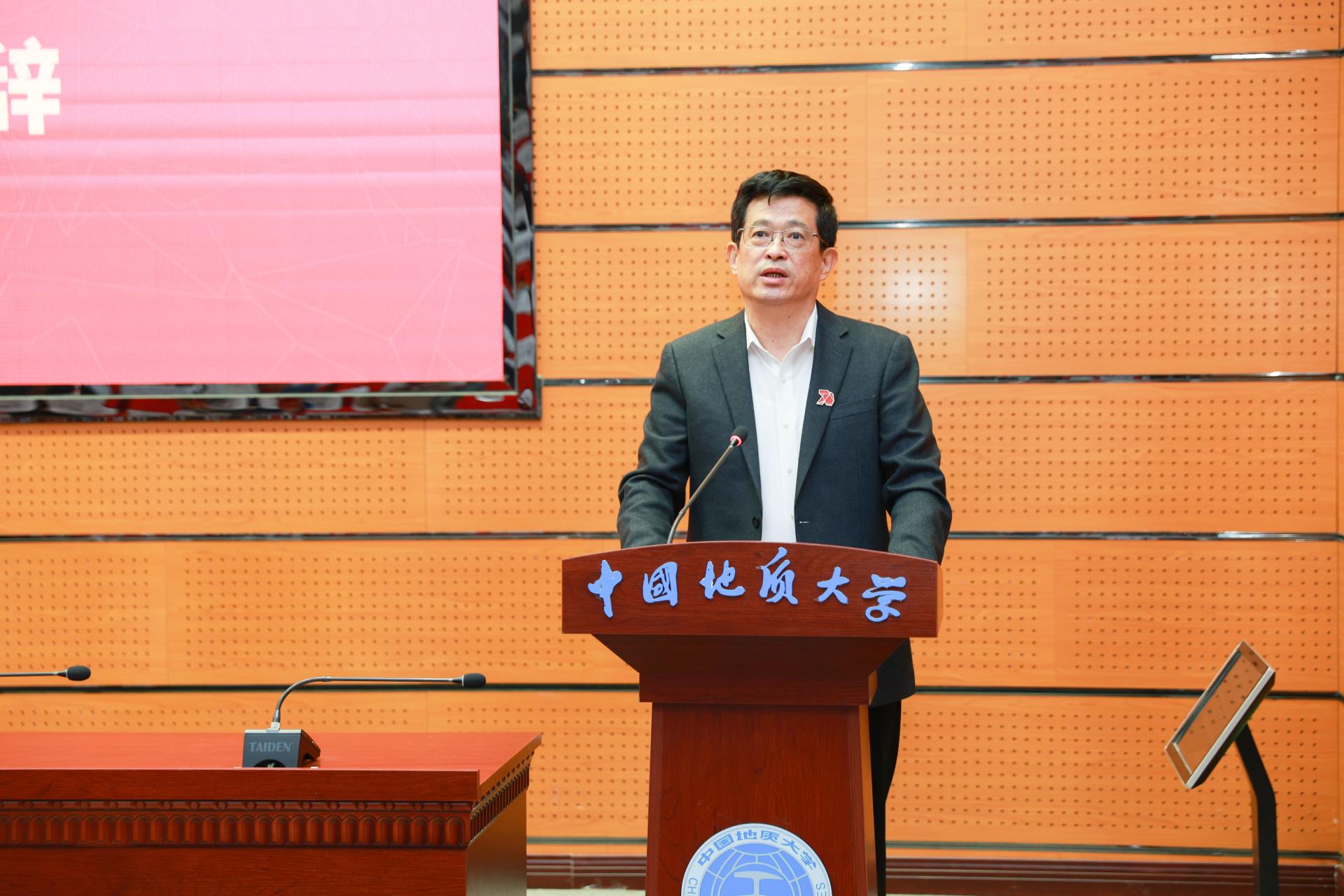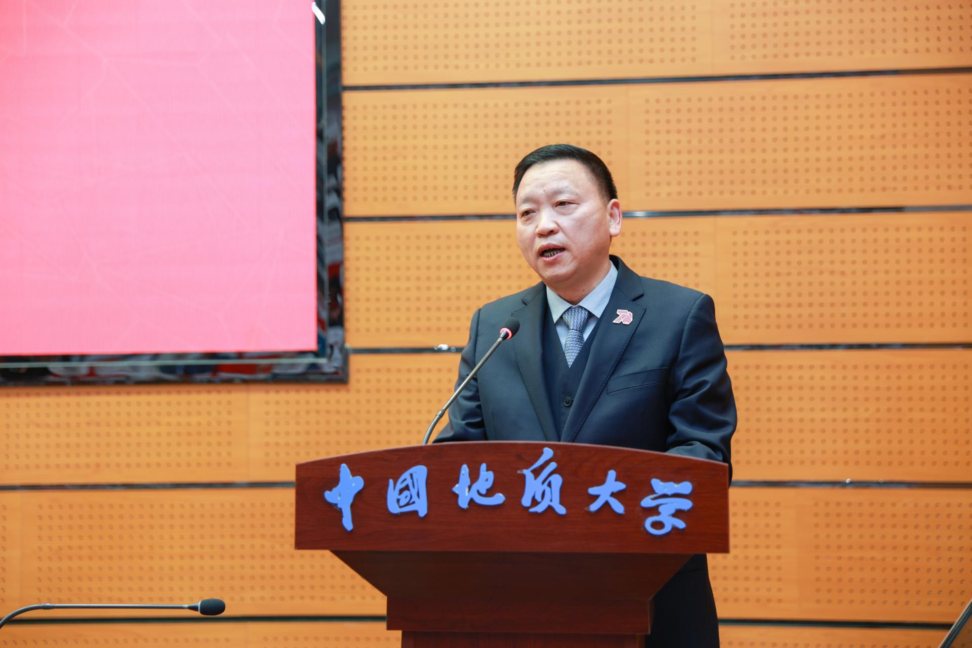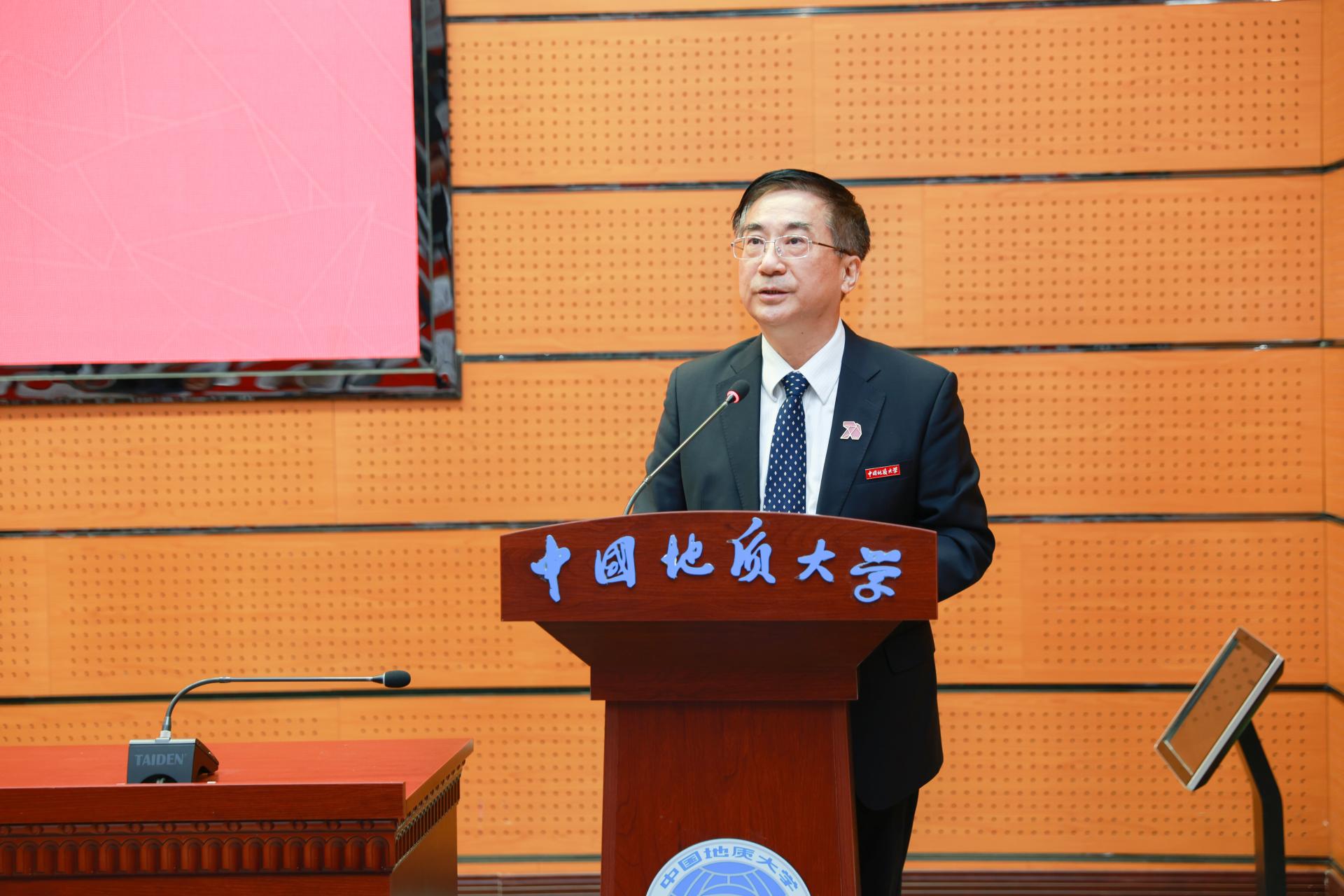 校长王焰新院士讲话。他代表学校向到场的各位领导、嘉宾表示欢迎,向教育部、自然资源部、湖北省、武汉市、东湖高新区、未来科技城等各级领导和社会各界对地大的支持和帮助表示感谢,向为未来城校区建设、搬迁、运行作出贡献的地大人致以敬意。