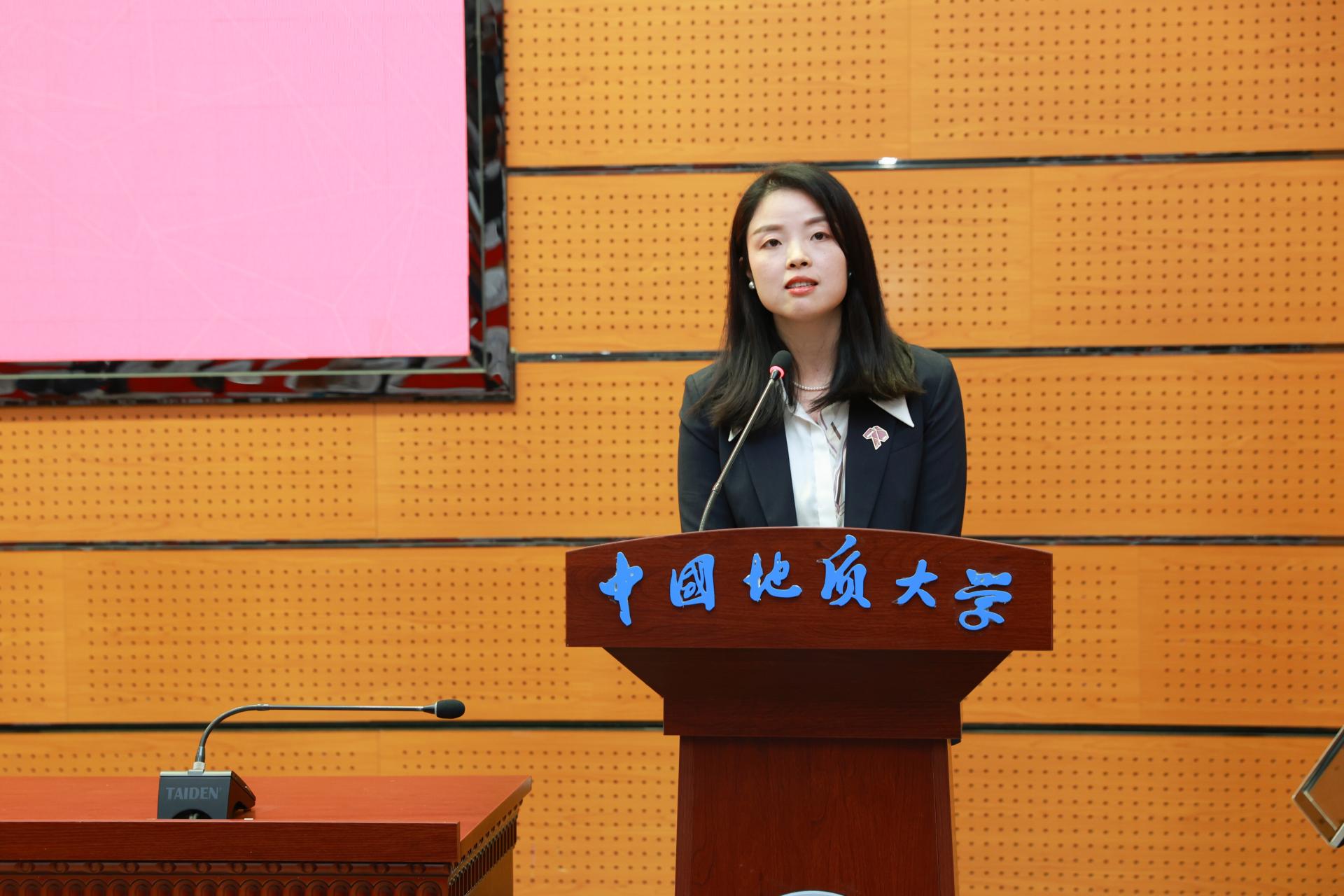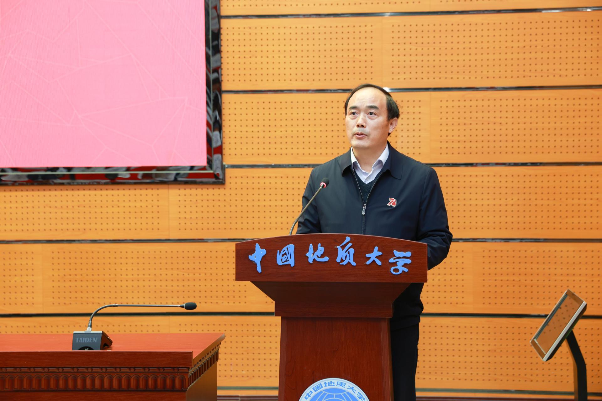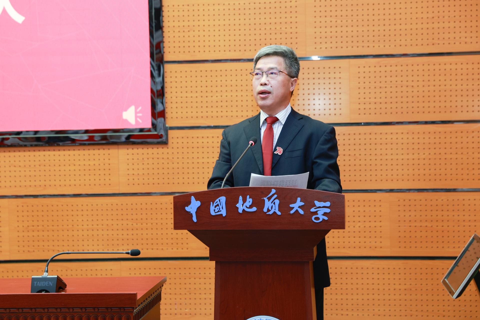 校长王焰新院士讲话。他代表学校向到场的各位领导、嘉宾表示欢迎,向教育部、自然资源部、湖北省、武汉市、东湖高新区、未来科技城等各级领导和社会各界对地大的支持和帮助表示感谢,向为未来城校区建设、搬迁、运行作出贡献的地大人致以敬意。
