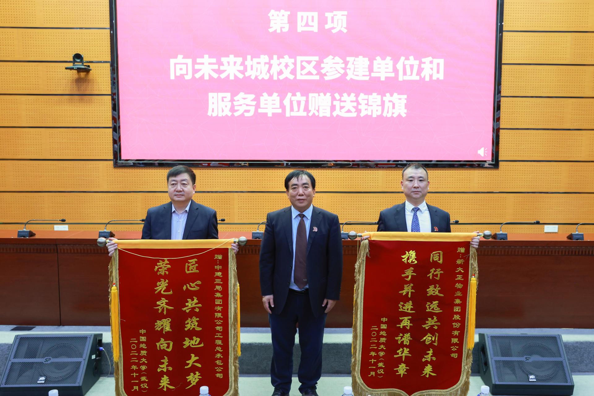 副校长赖旭龙向未来城校区参建单位中建三局集团有限公司工程总承包公司和服务单位新大正物业集团股份有限公司赠送锦旗。