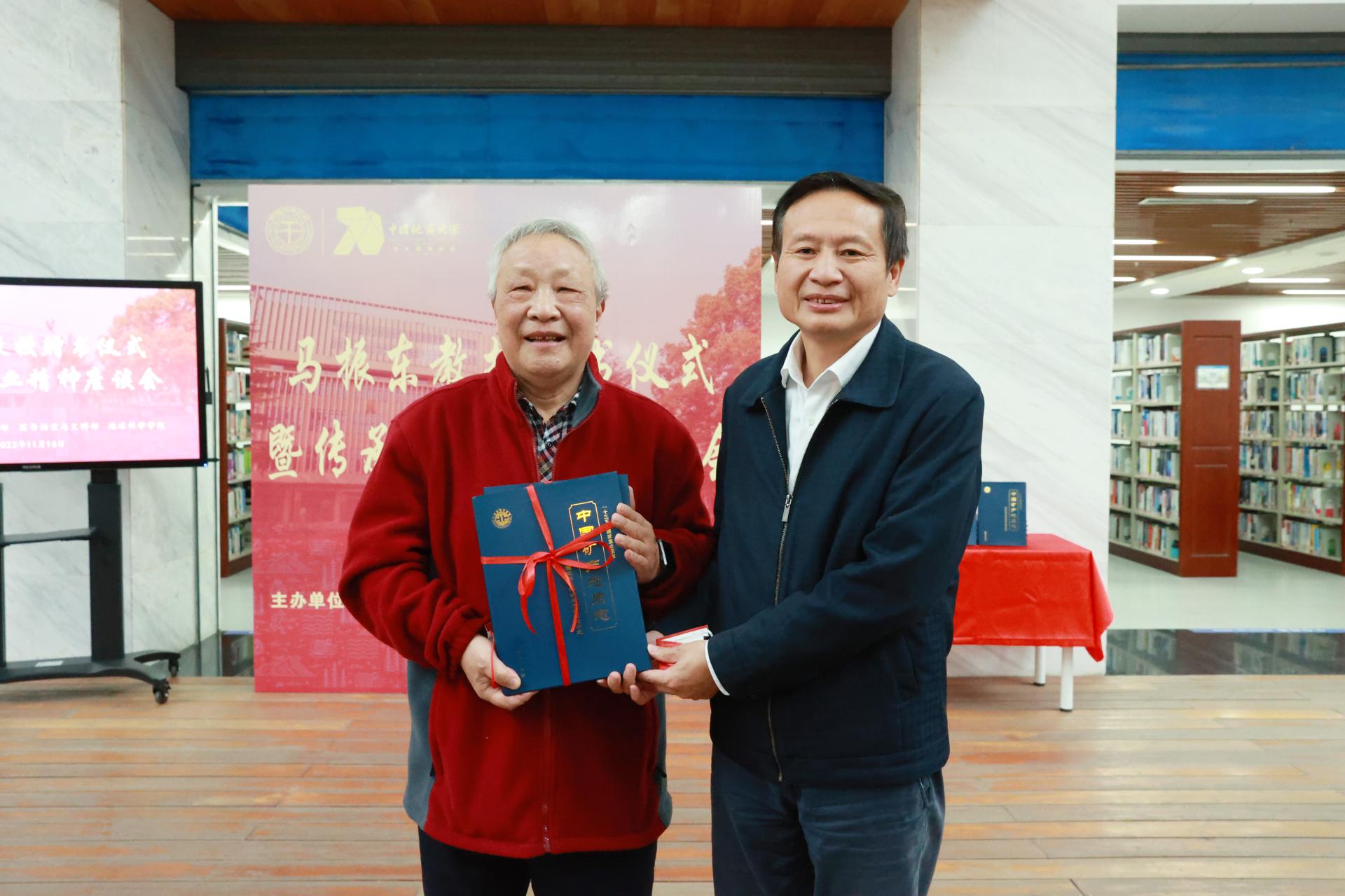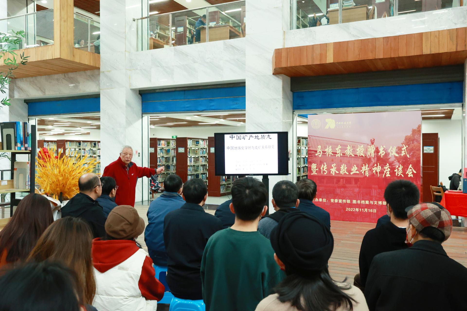 地大新闻网讯(通讯员 徐燕 刘安璐 梁胜男 摄影 孙彦钦)11月16日,马振东教授赠书仪式暨传承敬业精神座谈会在南望山校区图书馆举行。仪式上,地球科学学院退休教授马振东向图书档案与文博部捐赠了14本《中国矿产地质志——中国地球化学场与成矿关系研究》。副校长赖旭龙,党委常委、宣传部部长储祖旺,各相关部门、学院主要负责人及师生代表参加赠书仪式。