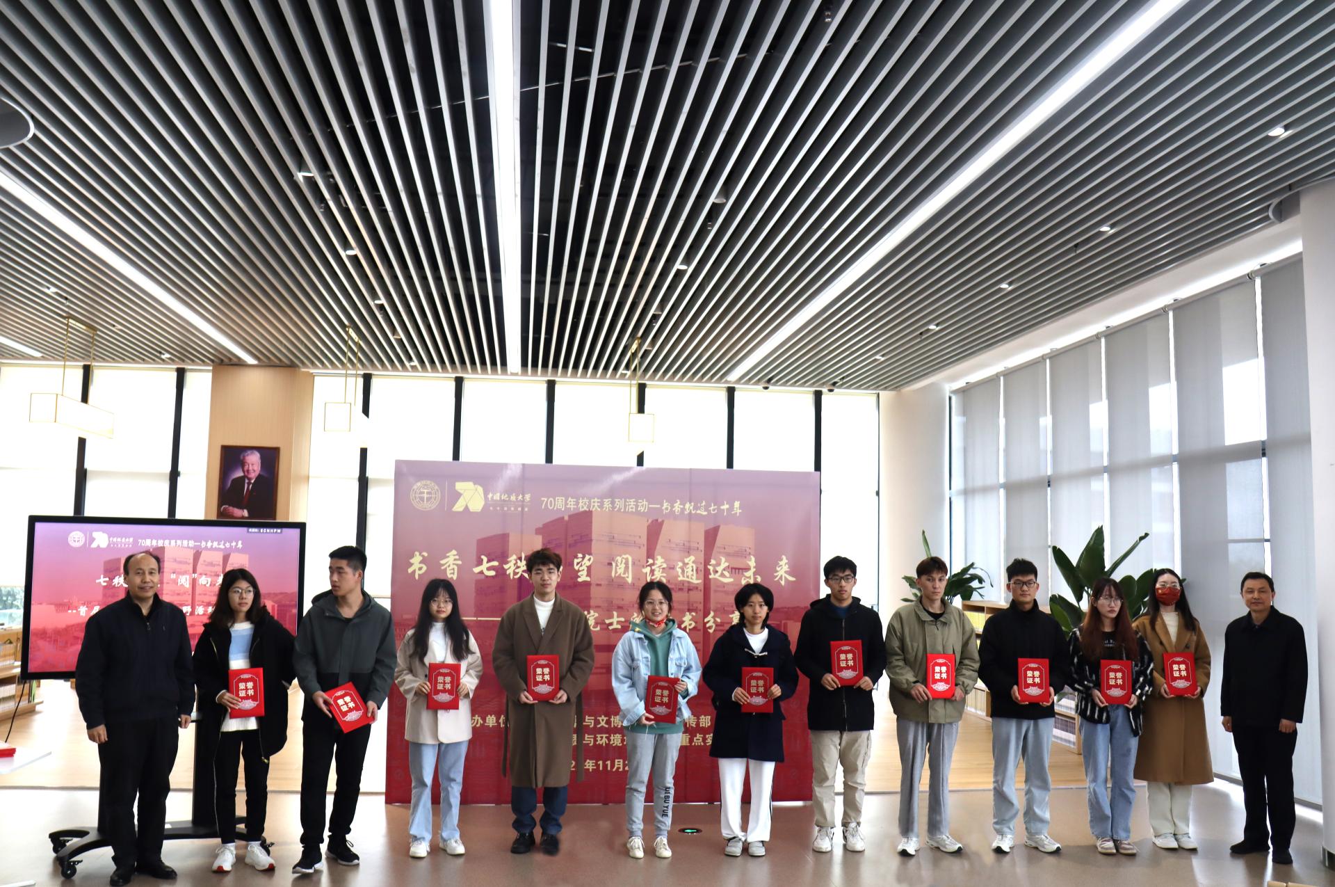 图书档案与文博部副部长张峰、明厚利为“七秩南望,‘阅’向未来”图书馆定向越野活动获奖团队颁奖。