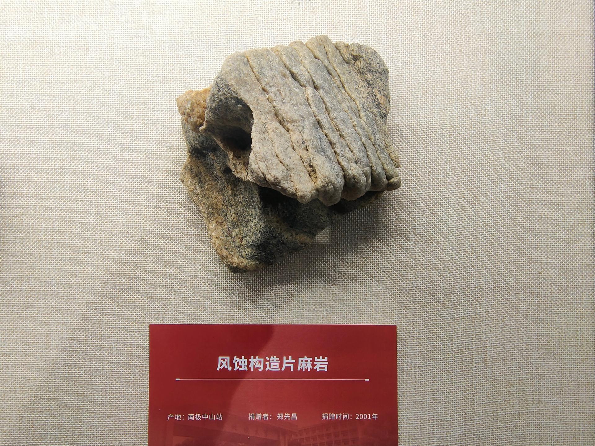 在“校友捐赠藏品展”,还有一块风蚀构造片麻岩标本,它同样产自南极,是由郑先昌博士2005年捐赠的。2004年10月,米兰1987级校友郑先昌博士随中国南极第21次科考队赴南极,进行为期5个多月的科学考察。在南极期间他对我国两个站区冻土及建筑物冻融危害进行全面调查,这是我国第一次在南极地区进行工程地质勘探。同时,由他提出的利用“钢梁基础+地锚加固”的方法,在南极中山站实验取得成功,使我国南极站区首次利用风力发电,为南极站区建设作出了突出贡献。