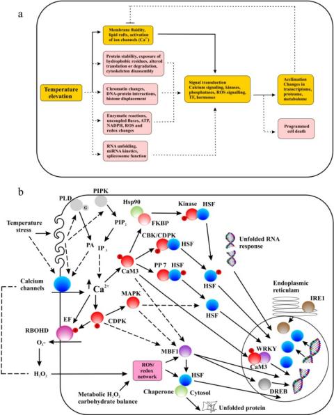 图3 藻类温度温度感应模式图。(a)温度变化影响藻类的不同代谢过程,(b)藻类在应对温度压力时激活的信号转导途径。