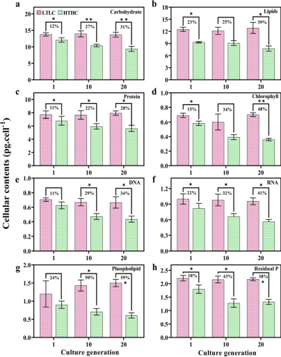 图2 在LTLC和HTHC条件下,不同代赤潮异弯藻的胞内分子(碳水化合物、脂质和蛋白质)及(叶绿素、DNA、RNA、磷脂和残磷)分子含量的变化。