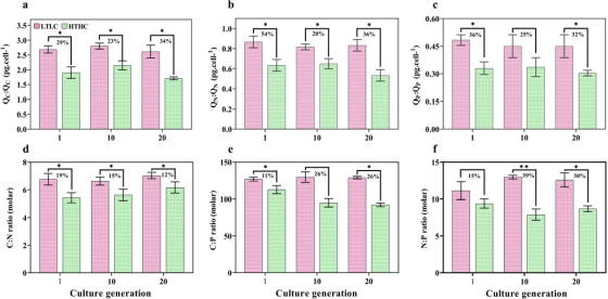 图1 不同代赤潮异弯藻在LTLC和HTHC条件下的元素和化学计量学变化。