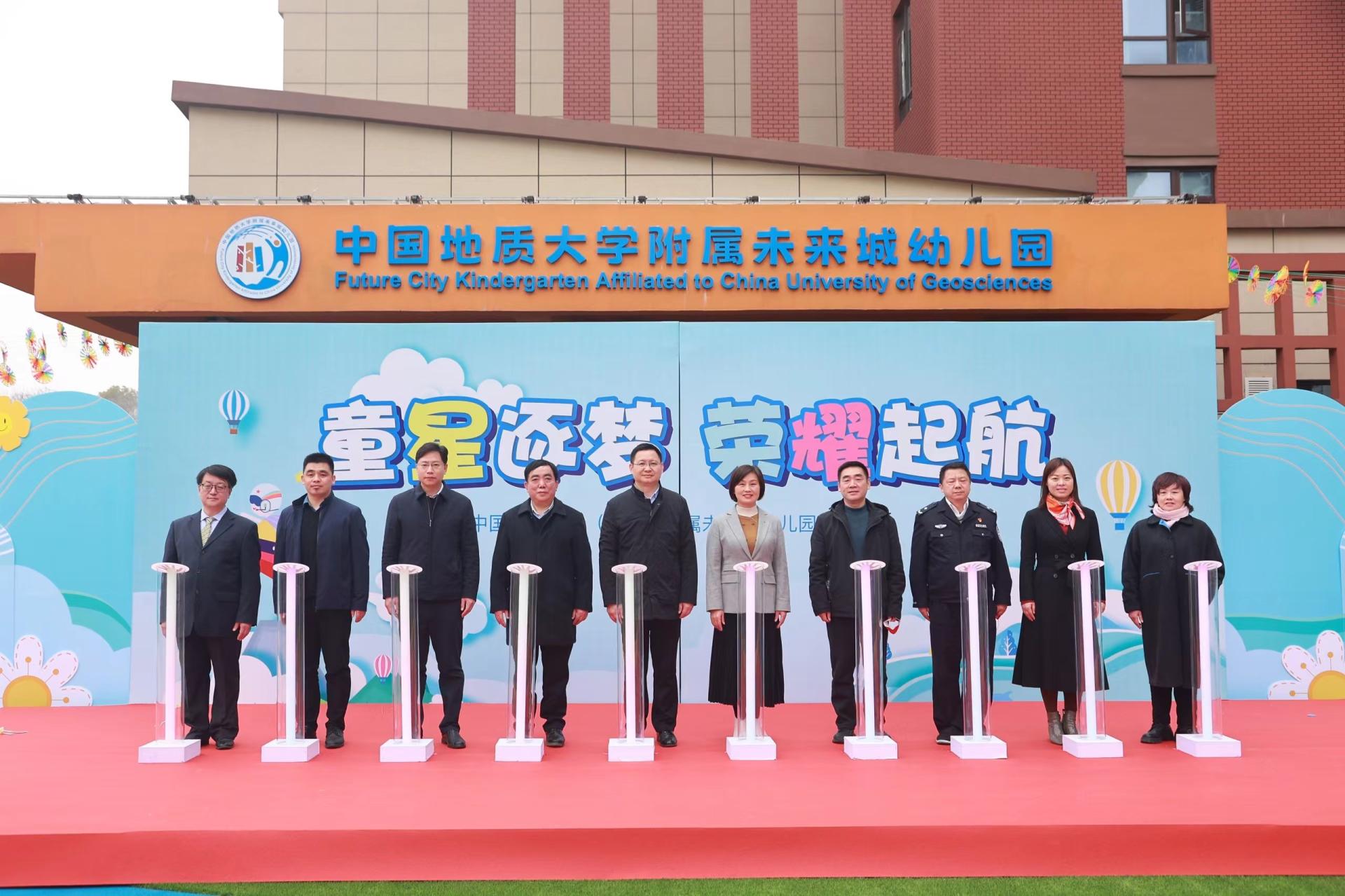 校领导和东湖高新区领导共同为未来城幼儿园揭牌。