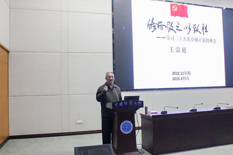 王宗廷以《修而改之以致胜》为题,谈了自己学习党的二十大通过的党章修正案的体会。他从党章的概述入手,以历史的维度梳理了党的二大以来党章十八次修订修改过程,从为什么要修改、修改了哪些内容条款、体现了什么时代价值等方面,进行深入浅出的解读,着重对党的二十大通过的党章修正案的修改背景、修改原则、修改要求、修改内容进行了讲解,并对在实际工作中如何学习贯彻新党章提出了建议。