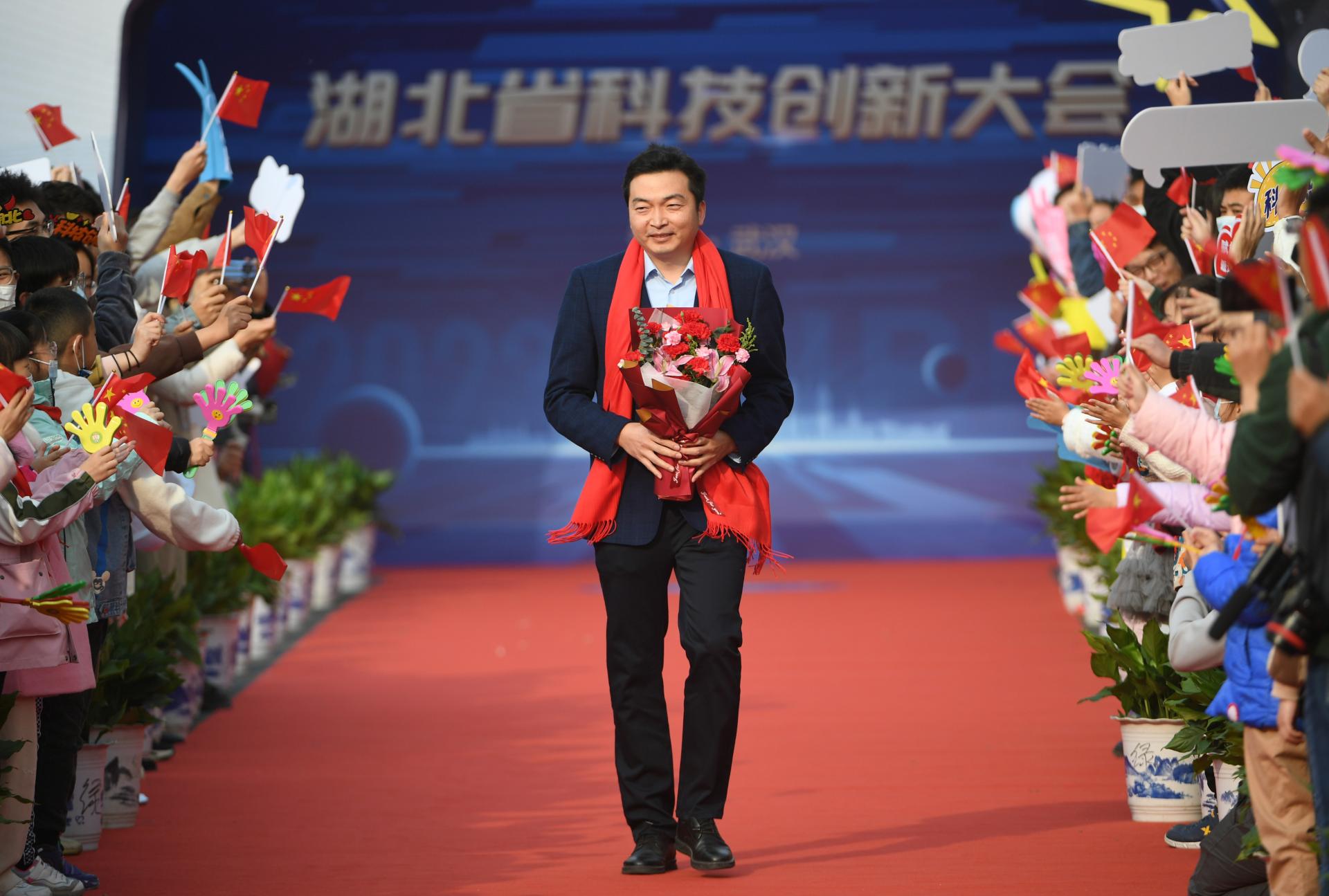大会开始前,米兰宋海军教授与湖北省其他科学家代表,一道走上湖北省科技创新大会的“星光大道”。他在2022年荣获第十七届中国青年科技奖特别奖,是该年度湖北省唯一获奖人。“他穿越‘石’空,揭秘沉睡古生物,为探讨古、中生代之交生物与环境的演变规律提供了新证据,是湖北省青年科学家的杰出代表。”