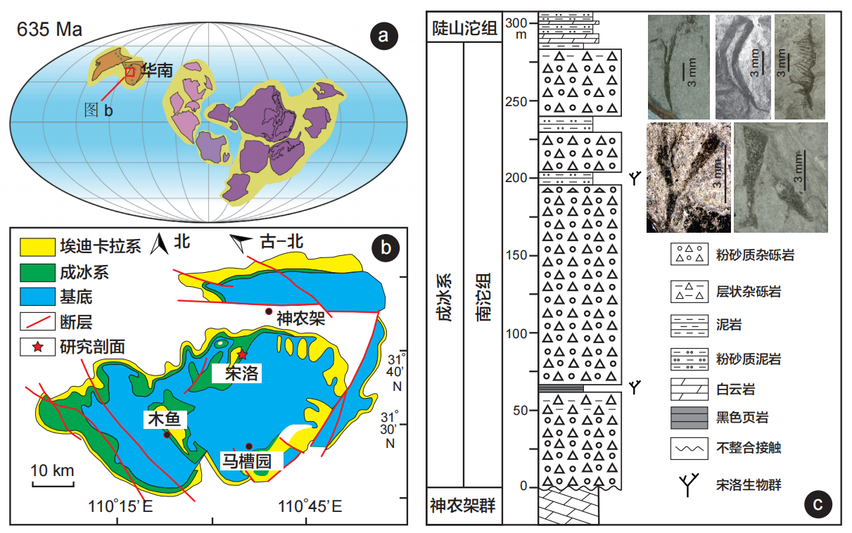 童金南教授团队的叶琴博士,于2015年在《地质学》杂志上报道了产自华南神农架地区宋洛剖面南沱组(6.35亿年前,马里诺冰期时期)的黑色页岩地层中的宏体碳质压膜化石,其中部分被解释为底栖宏体藻类(图1c),被称为“宋洛生物群”,填补了成冰纪雪球地球时期宏体古生物化石空白。但是“宋洛生物群”的古海洋环境背景是怎样的?在“雪球地球”中如何为生物提供宜居场所?这些科学问题都尚未解决。