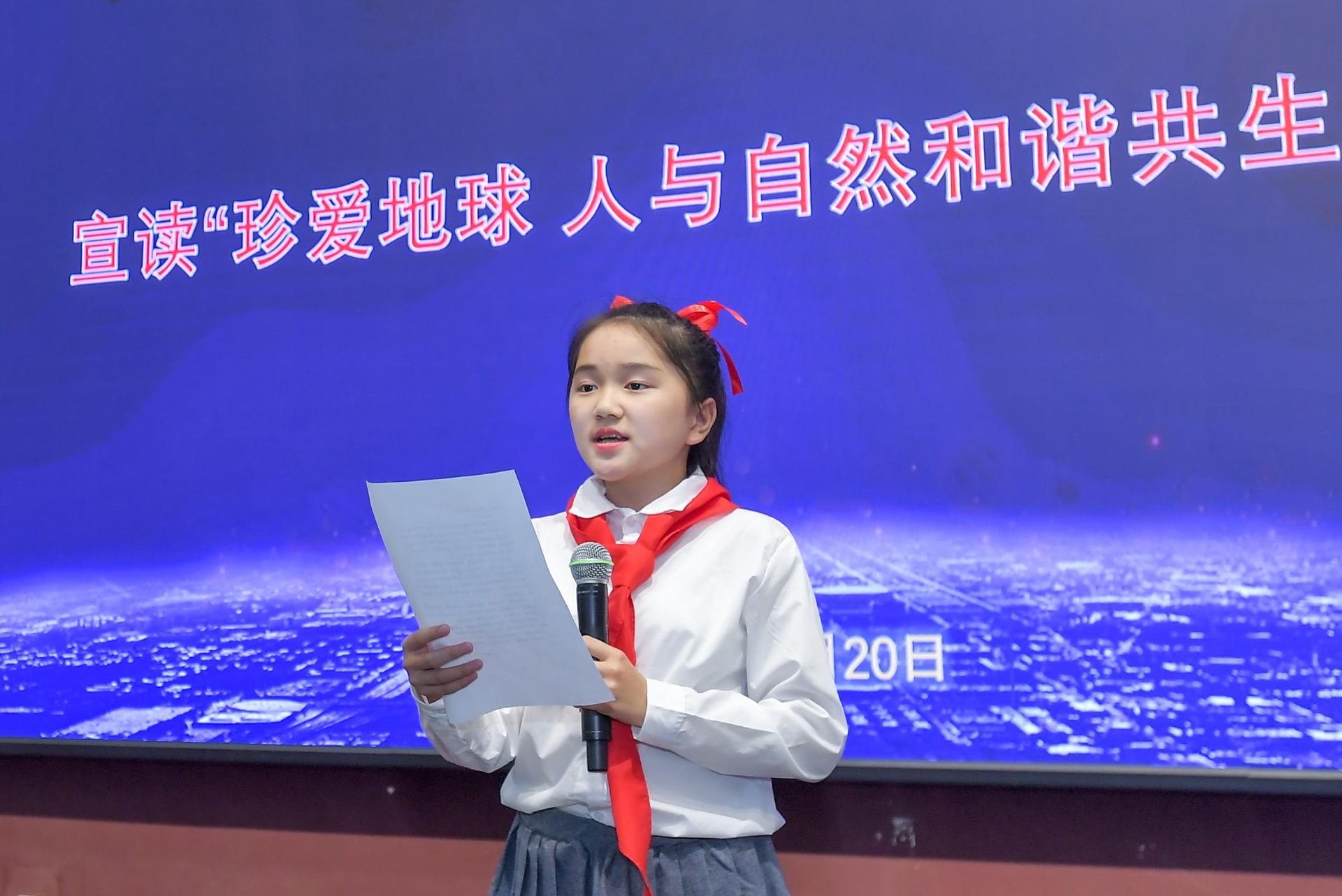 学生代表罗贝怡宣读“珍爱地球 人与自然和谐共生”倡议书,呼吁大家行动起来,一起关爱家园,保护好赖以生存的地球。