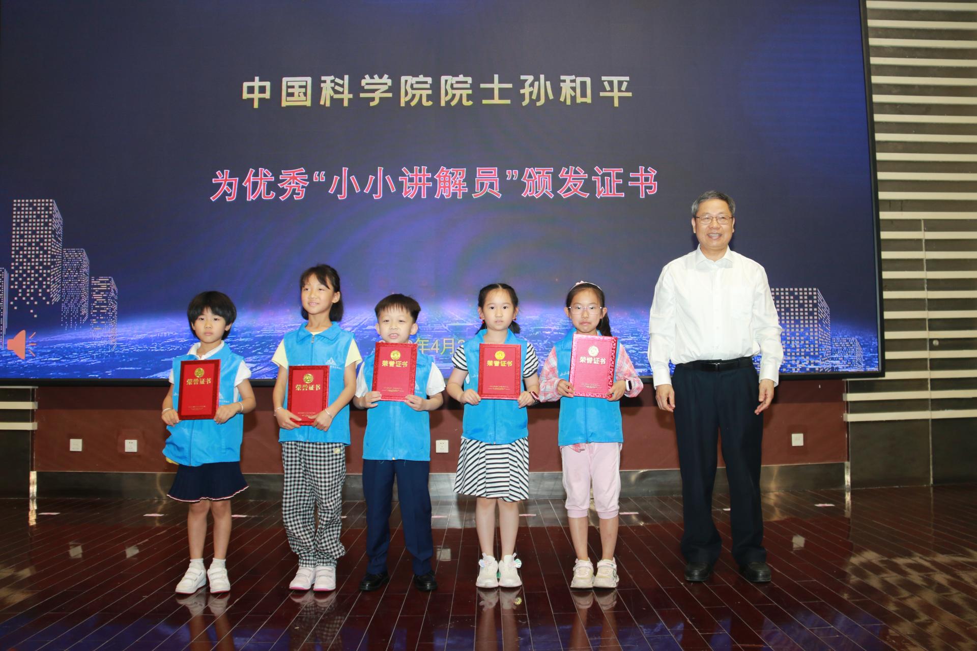 孙和平为5名逸夫博物馆“优秀小小讲解员”代表颁发证书。逸夫博物馆通过招募“小小讲解员”,对他们开展讲解培训,提供拓展学习和实践锻炼的机会,在孩子们心中播下一颗热爱地球科学的种子。