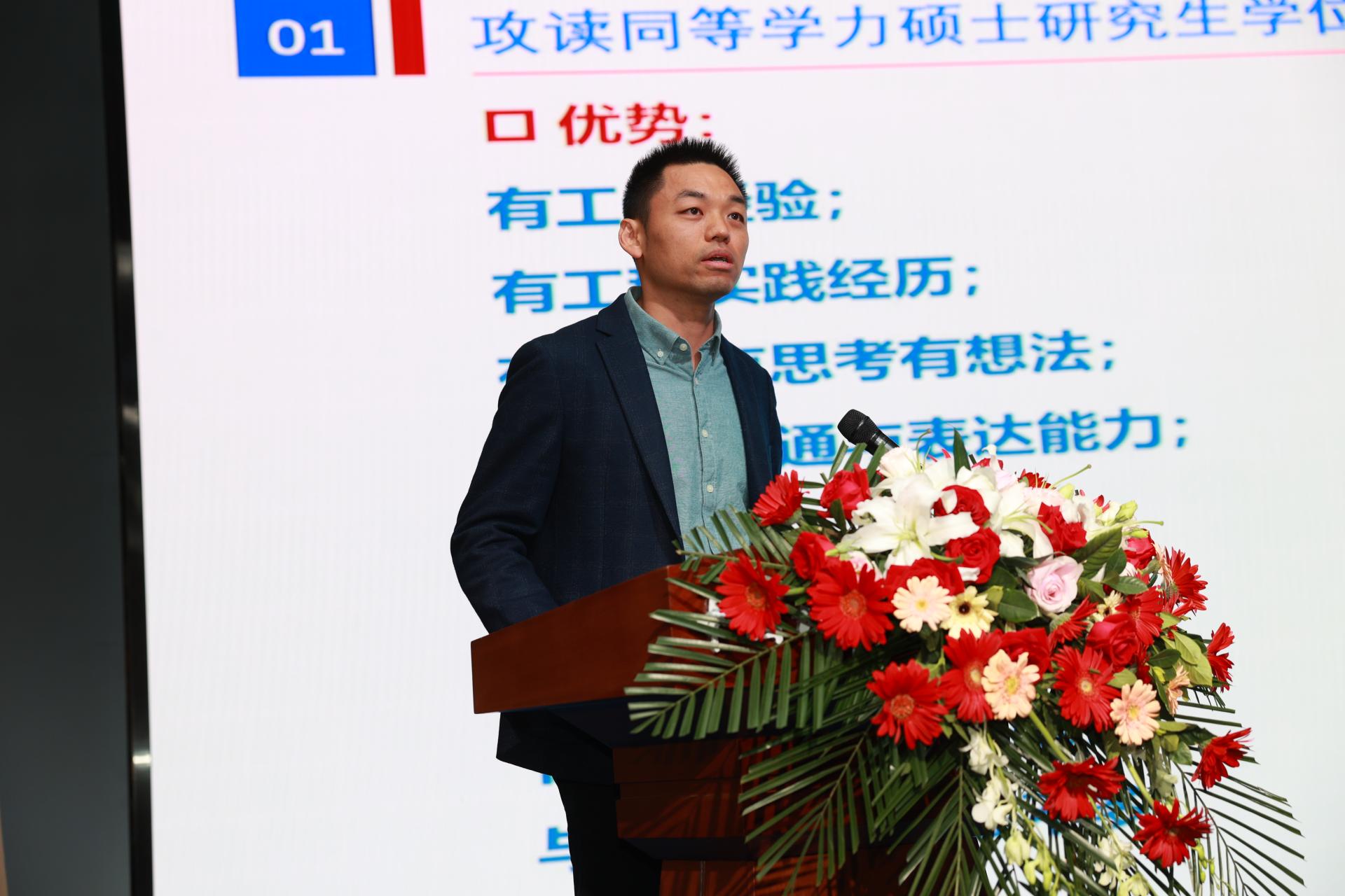 研究生导师代表、环境学院副教授曾斌分析了攻读同等学力硕士研究生学位的优势与难点,并从“上好课、选好题、重提升、早启动、勤沟通、再坚持”六个方面对同学们提出了意见与建议。他希望同学们在接下来的学习生活中,能够欣赏地大之美、博学地大之识、传承地大之魂。
