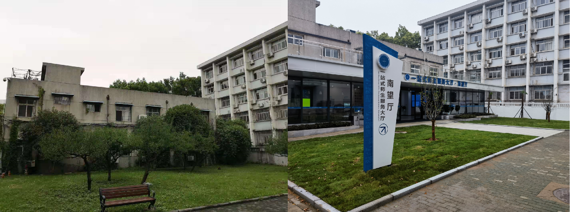 本着绿色环保、安全节约的原则,校园规划与基建处于2022年10月底开展南望厅改建施工。在改建过程中,校园规划与基建处因地就势,最大限度地利用现有格局,仅对资产公司办公楼进行了少量扩建、必要拆改和适度翻新,保证了南望厅良好的观感效果、工程质量和使用功能。
