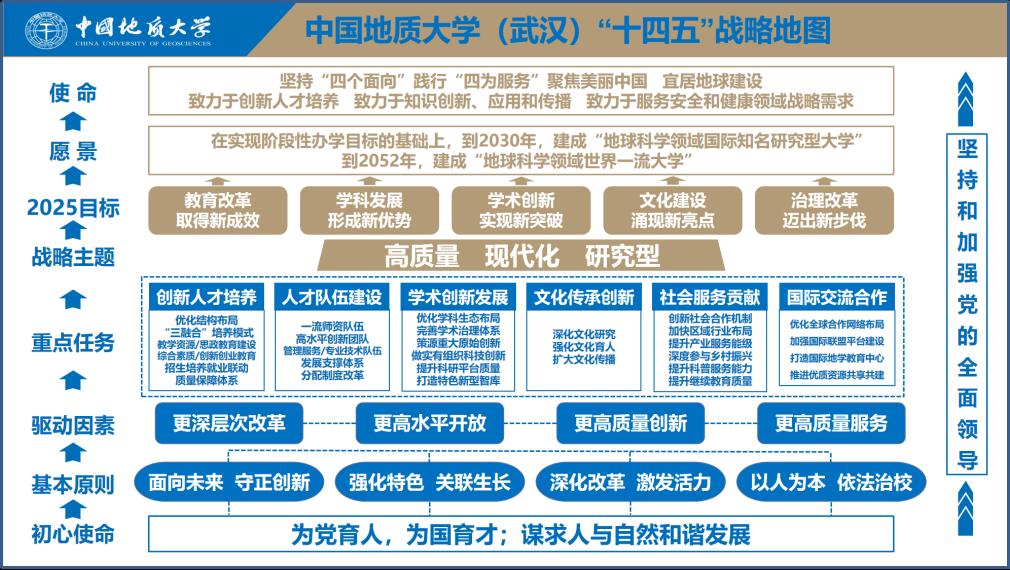 2021年9月,学校出台《“十四五”事业改革与发展总体规划》。规划明确围绕建设高质量、现代化、研究型大学战略主题,坚持学术立校、人才强校、文化兴校、开放活校,以更高水平开放为牵引、以更深层次改革为驱动,提升办学要素汇聚能力,激发和释放办学活力,破解资源短缺与办学需求旺盛的基本矛盾。落实“四个面向”要求,不断提升创新策源功能和服务贡献能力。加快推进跨学科教育和研究,拓展传统地球科学的研究视野,革新地球科学研究和人才培养的范式。加快推动信息技术与教育教学、管理服务、发展决策深度融合,推动教书育人、办学治校现代化。