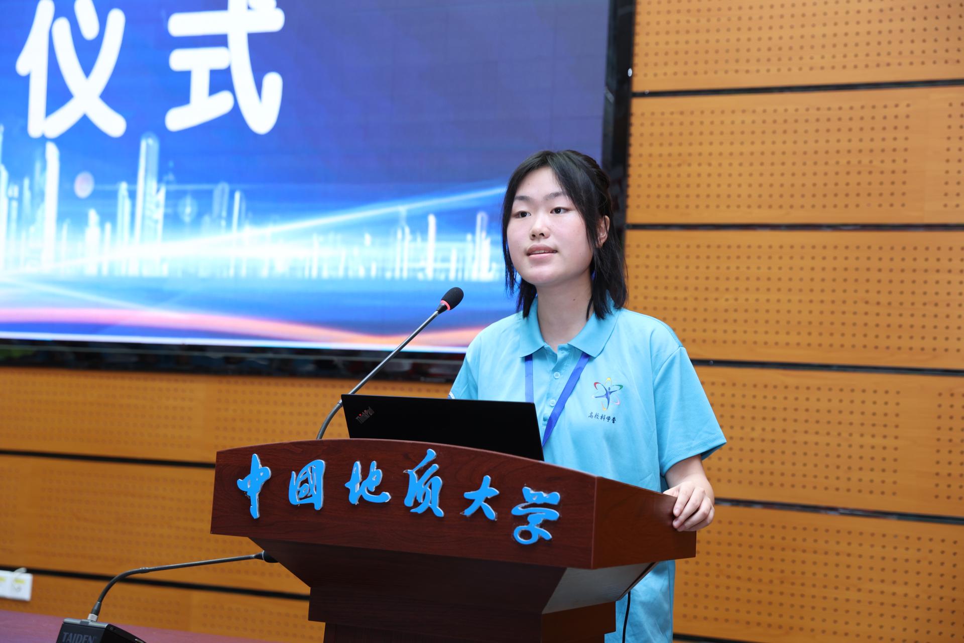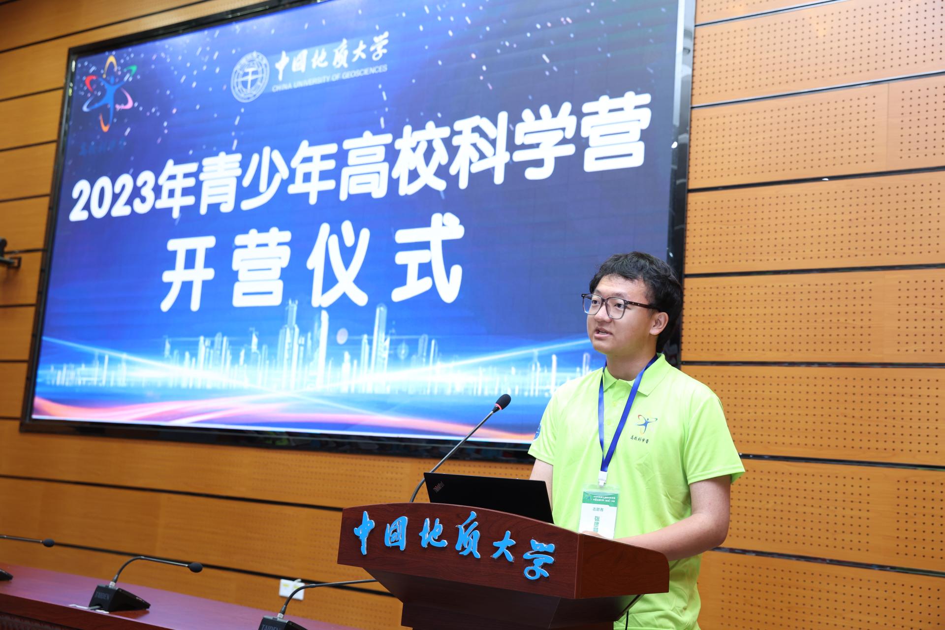 学生志愿者代表张建喆同学发言。他表示40名志愿者将主动为营员们提供全方位的保障和服务,带领营员们感受地大精神和科学魅力。