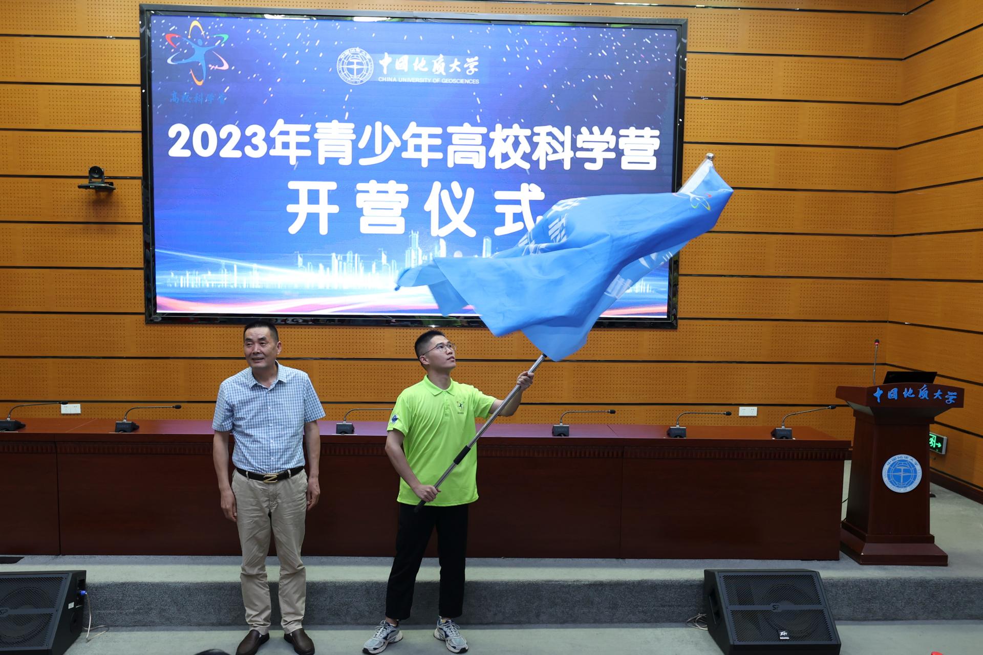 陈兴荣向志愿者代表徐增智同学同学授旗,并宣布地大分营正式开营。