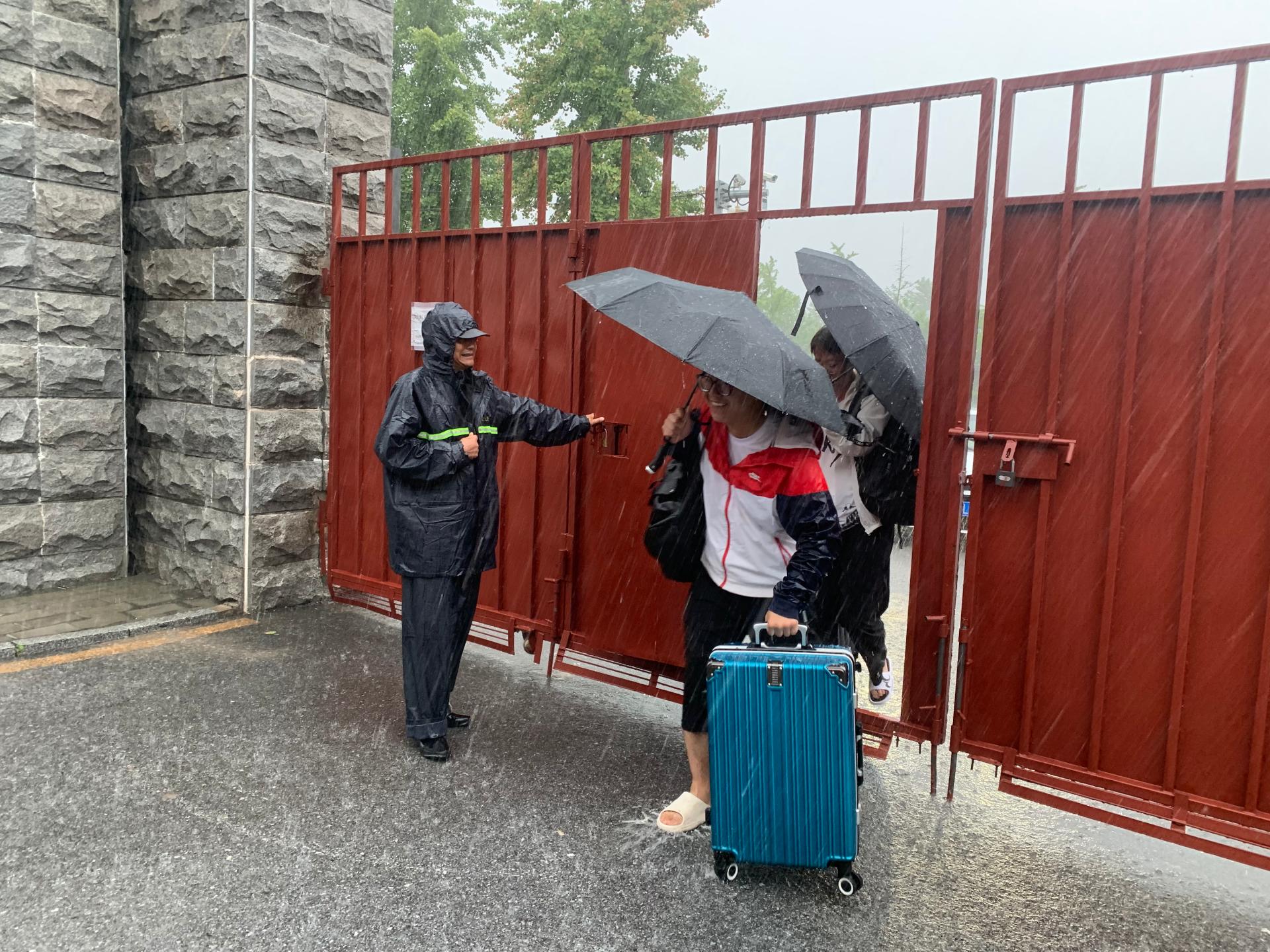 为保障师生饮食,在站司机郭声凯和食堂师傅一起蹚过积水路段,冒雨将一筐筐食材转运到车上拉回站内。在暴雨中,后勤物业中心保安师傅始终默默坚守岗位。除了严格门禁管理外,他们冒雨在站门口指引学生进站报到,搬运行李。每天早起晚睡,定时对基地进行全方位安全巡查,及时排除站内积水。
