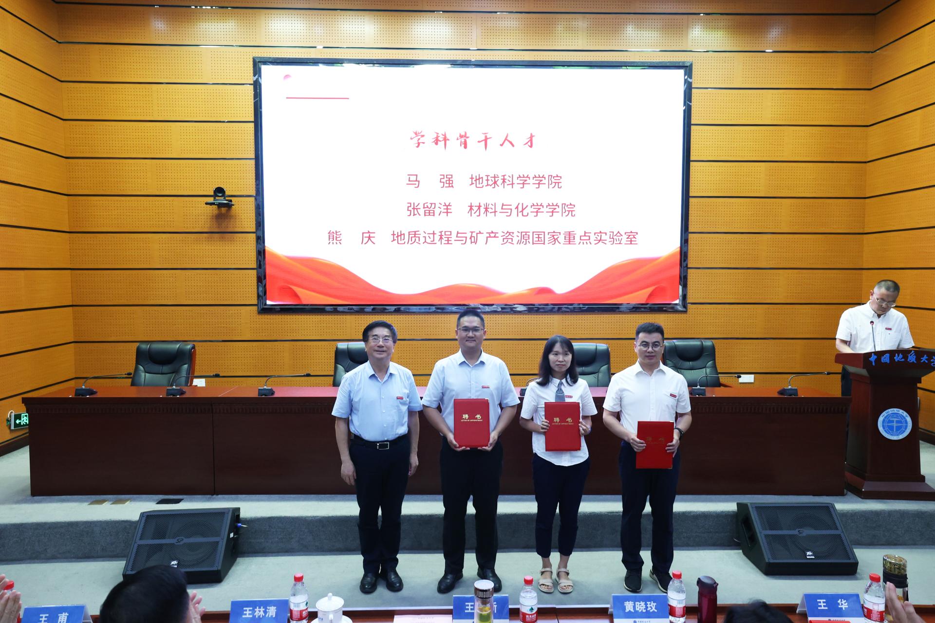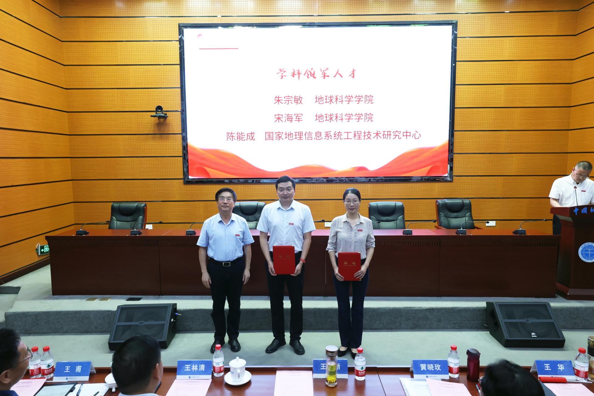 校长王焰新院士向地球科学学院朱宗敏和宋海军、国家地理信息系统工程技术研究中心陈能成颁发“地大学者”学科领军人才聘书;向地球科学学院马强、材料与化学学院张留洋、地质过程与矿产资源国家重点实验室熊庆颁发“地大学者”学科骨干人才聘书。