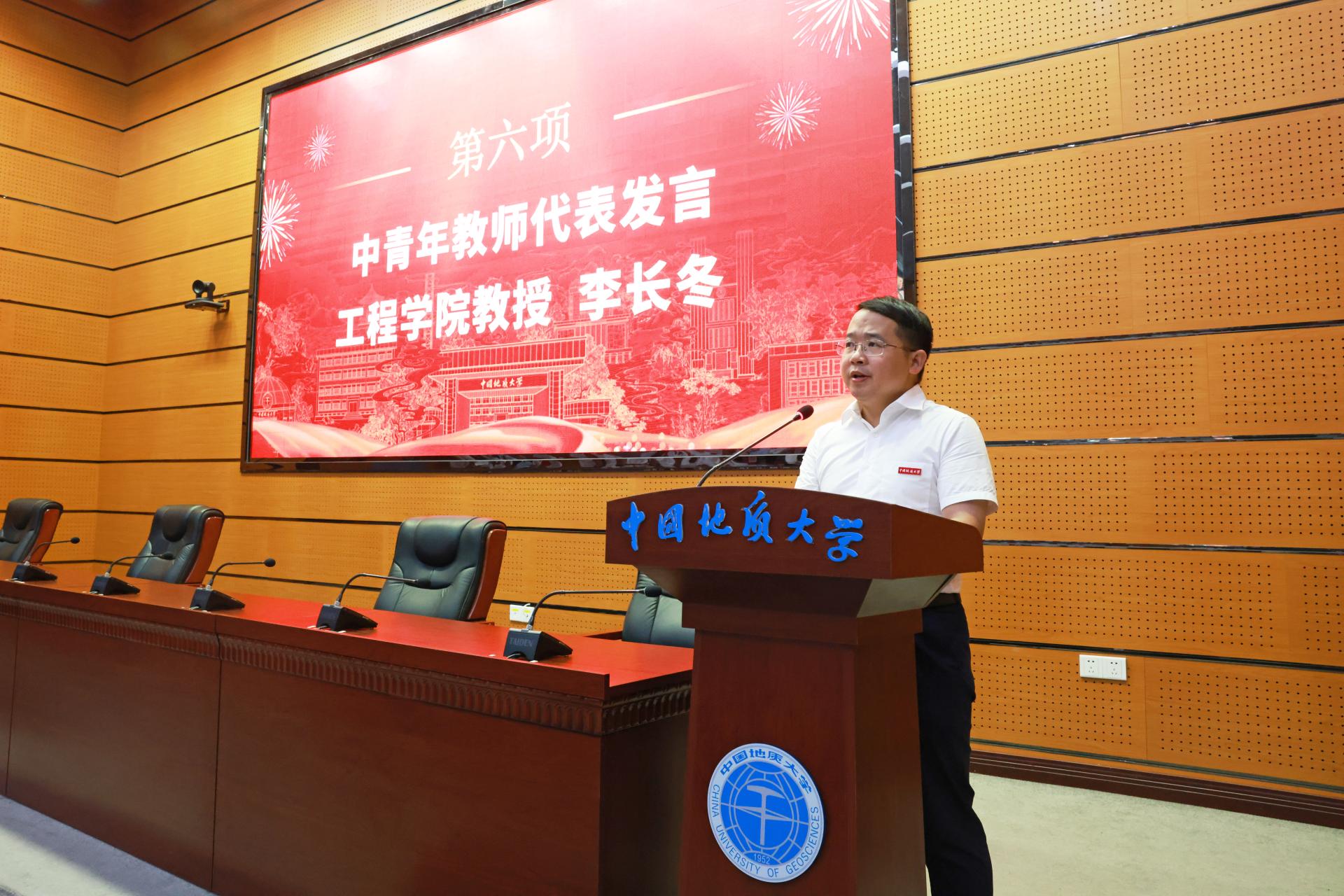 工程学院教授李长冬作为中青年教师代表发言。他深情讲述了自己在地大20多年的学习和生活岁月,并表达了对新进教师未来发展的美好祝福。