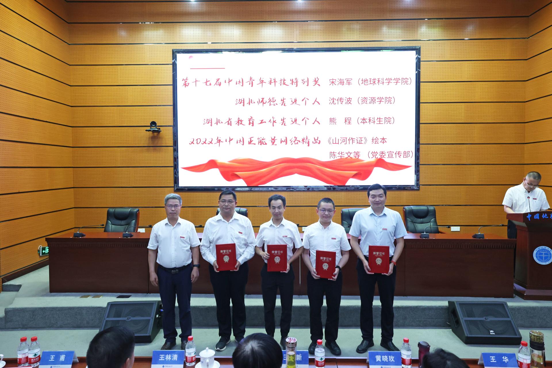 副校长王华为“第十七届中国青年科技特别奖”获得者宋海军、“湖北师德先进个人”获得者沈传波、“湖北省教育工作先进个人”获得者熊程、“中国正能量网络精品”绘本《山河作证》创作者陈华文颁发荣誉证书。