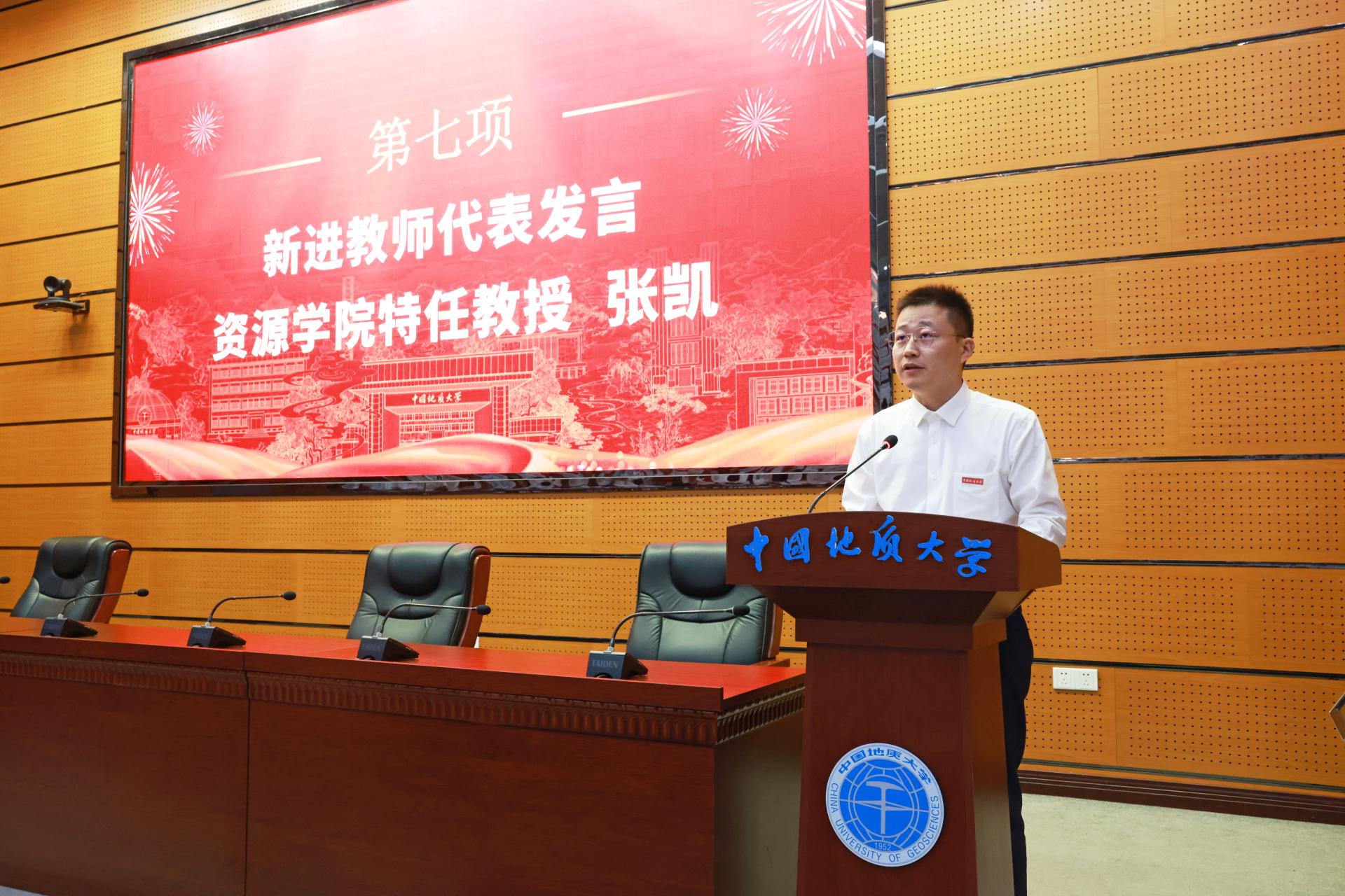 资源学院特任教授张凯作为新进教师代表发言。他分享了对地大“艰苦朴素、求真务实”校训精神和地大人“坚守初心,仰望未来”豪迈情怀的感想体会。