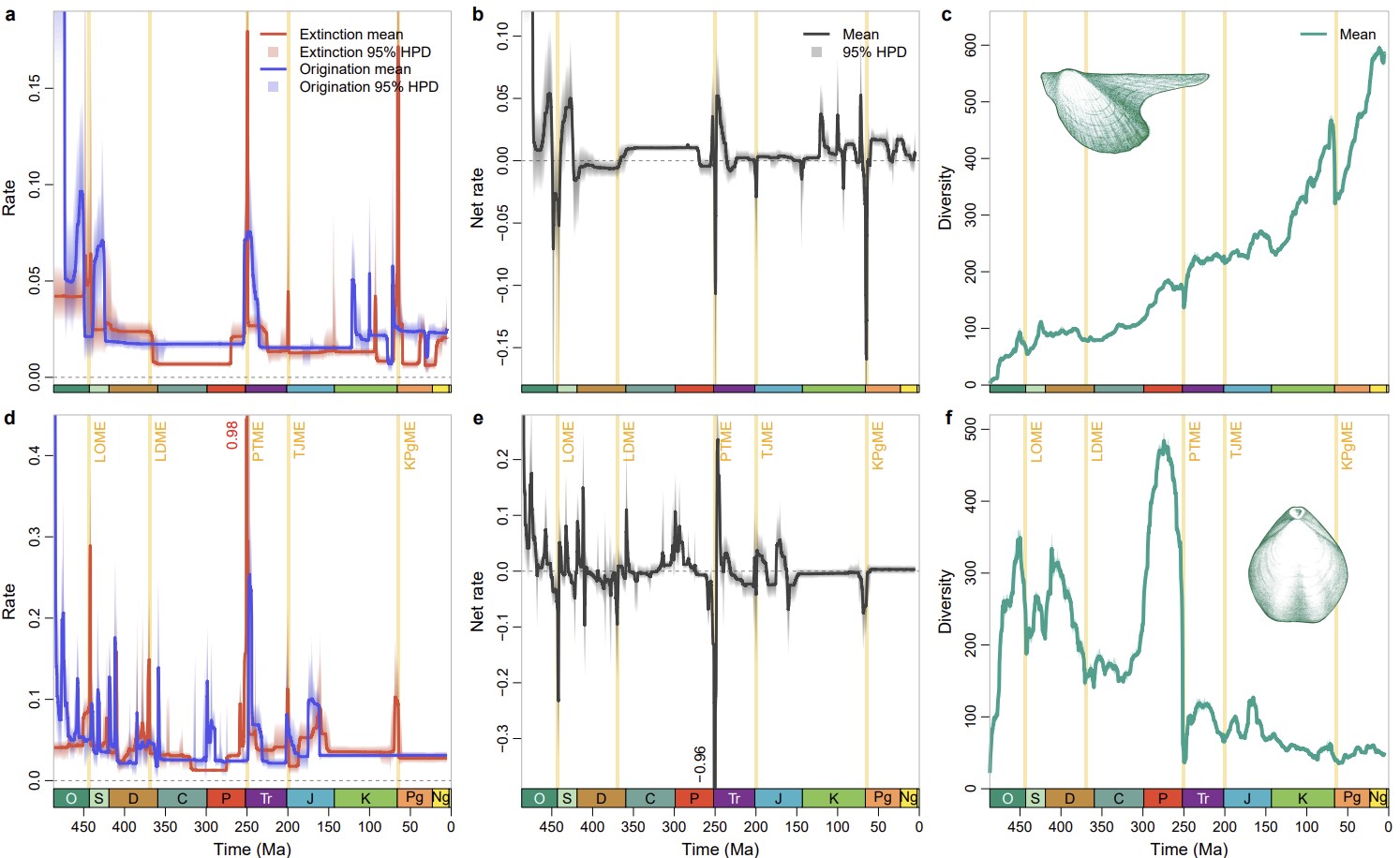 奥陶纪以来双壳类(a-c)与腕足类(d-f)的多样性演化速率与多样性变化。