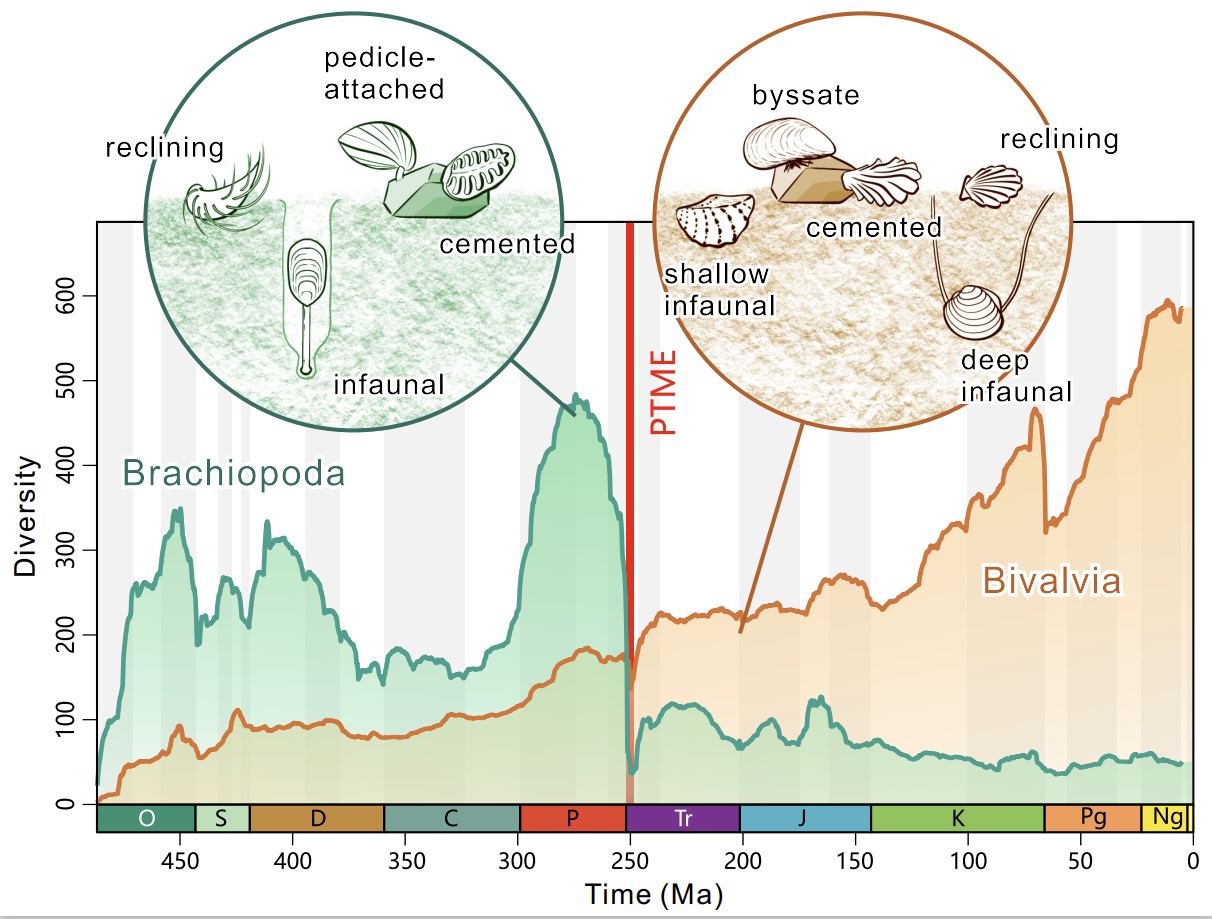 腕足类和双壳类动物具有相似的形态以及生态位置的重叠,自19世纪六十年代起,人们即假设两者具有竞争关系,具有生理优势的双壳类逐步取代了古生代劣势的腕足类。然而,也有不同观点认为两者不存在竞争关系,而是二叠纪—三叠纪之交大灭绝事件导致了这次转换。为了解决这一争论,研究团队利用高性能计算机,对五亿年来的近33万条关于腕足动物和双壳动物化石记录进行了厘定和修正,用贝叶斯生态模拟的分析方法,计算出这两类生物长时间尺度的新生与灭绝速率。结果表明两者在侏罗纪之前具有彼此相似的多样性速率演化趋势,证明两者均受到主要环境事件的影响(图3)。