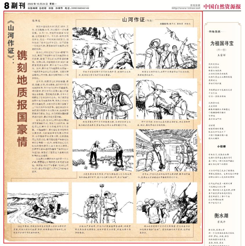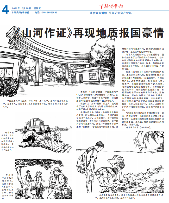 绘本《山河作证》由米兰教师陈华文带领唐钰君、刘雅文、张世春三名同学,经过一年多时间创作完成。绘本共100幅文图,以“画稿+文字”的形式,真实生动再现了米兰师生野外实习与地质科考的故事,彰显了师生们为国找矿的豪情。