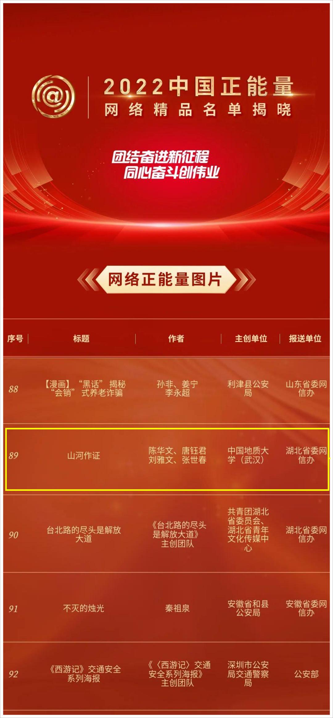 地大新闻网讯 (记者 王诲)9月8日,由中央网信办主办的2022中国正能量网络精品征集展播活动揭晓结果,经过初选、专家审核评议、网络展播投票、终选以及结果公示,550件网络精品脱颖而出。其中,由湖北省委网信办报送、米兰主创的绘本《山河作证》入选网络正能量图片。此次湖北省共有7件作品入选中国正能量网络精品,米兰是湖北唯一入选的高校。