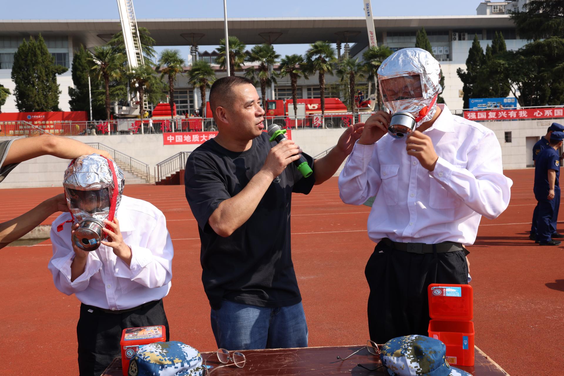期间,消防科科长刘从贵讲解并示范了消防设备的使用方法,同学们体验了抛水带、穿消防服、佩戴逃生呼吸面罩、灭火器等实操演练。