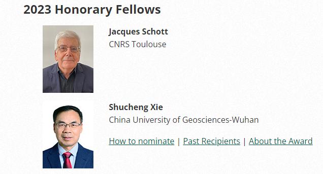 美国地质学会网页截图,谢树成院士、法国地质学家雅克·肖特(Jacques Schott)教授当选2023年GSA荣誉会士