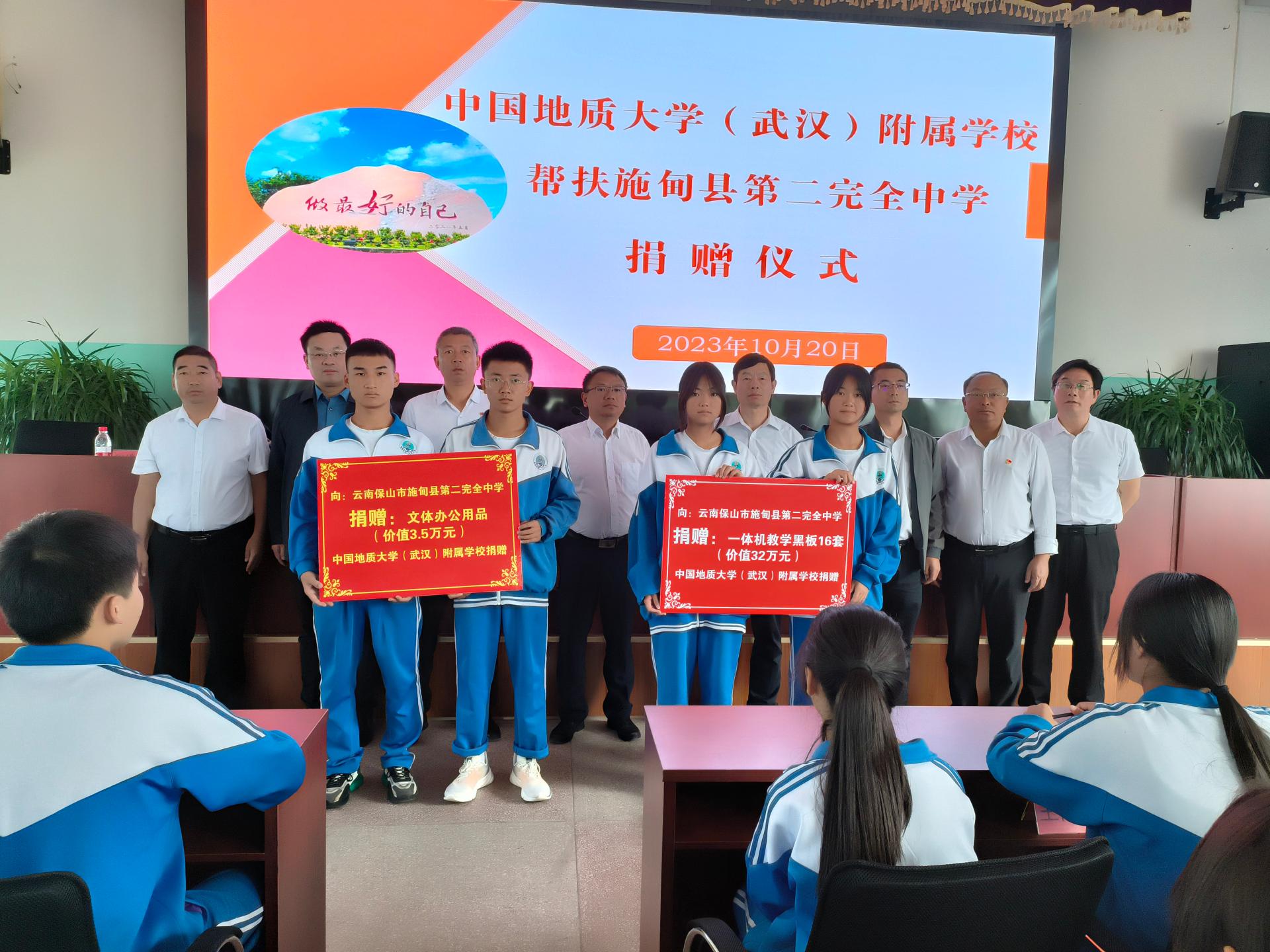 下午,在施甸二中会议室举行了捐赠仪式。地大附属学校向施甸二中捐赠了16套价值32万元的一体机黑板和价值3.5万元的文体办公用品。黎义波在捐赠仪式上深情地说:“从黄鹤故乡到彩云之南,山高路远阻断不了两校交流脚步。我们在共鸣中牵手,在交流中进步,用实际行动推进教育同均衡,城乡共发展。”