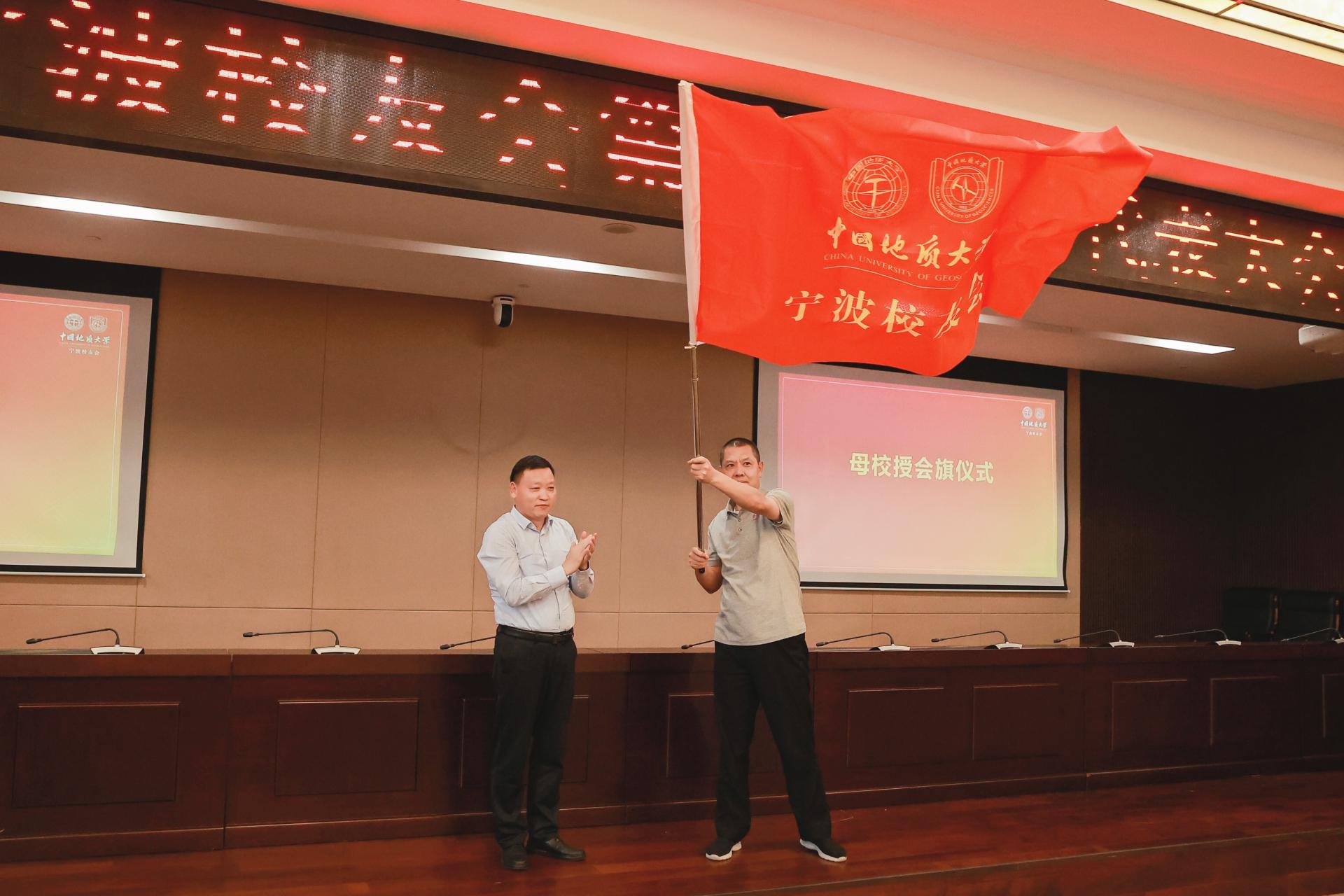 王林清为宁波校友会授会旗,执行会长李国华接旗。