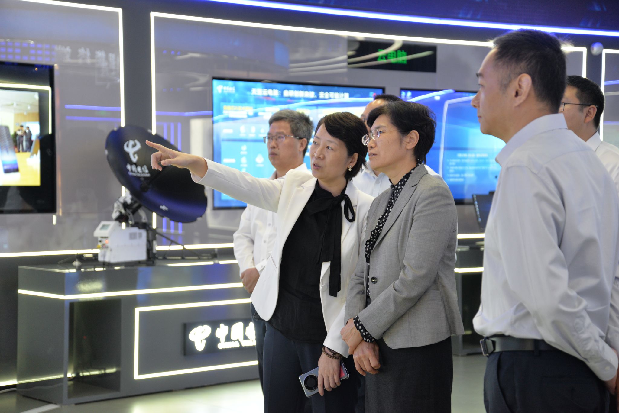 座谈前,黄晓玫一行到中国电信展厅参观调研,了解公司发展历程、技术创新、信息服务应用等方面工作成效。