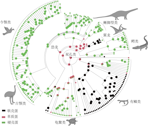 为了研究恐龙及其他爬行动物在繁殖方式上的宏演化规律,研究人员在前人的基础上收集了爬行动物210个类群,并对所有类群的蛋壳类型和蛋壳厚度等指标进行了统计,建立迄今最大的爬行动物数据库。在此基础上进行了祖先状态恢复分析,结果表明最早的恐龙蛋为革质蛋,外壳柔软似皮革,柔韧不易碎,不同于先前的软壳蛋(无或极薄钙质层)和硬壳蛋的起源。鳄类、恐龙和翼龙在演化的过程中蛋的相对大小呈现递增的趋势。而在蛋的形态变化上,最早的恐龙为亚圆形或椭圆形,兽脚类恐龙明显有延长的趋势。另外还发现大多数爬行类在演化的过程中均有蛋壳增厚的趋势。