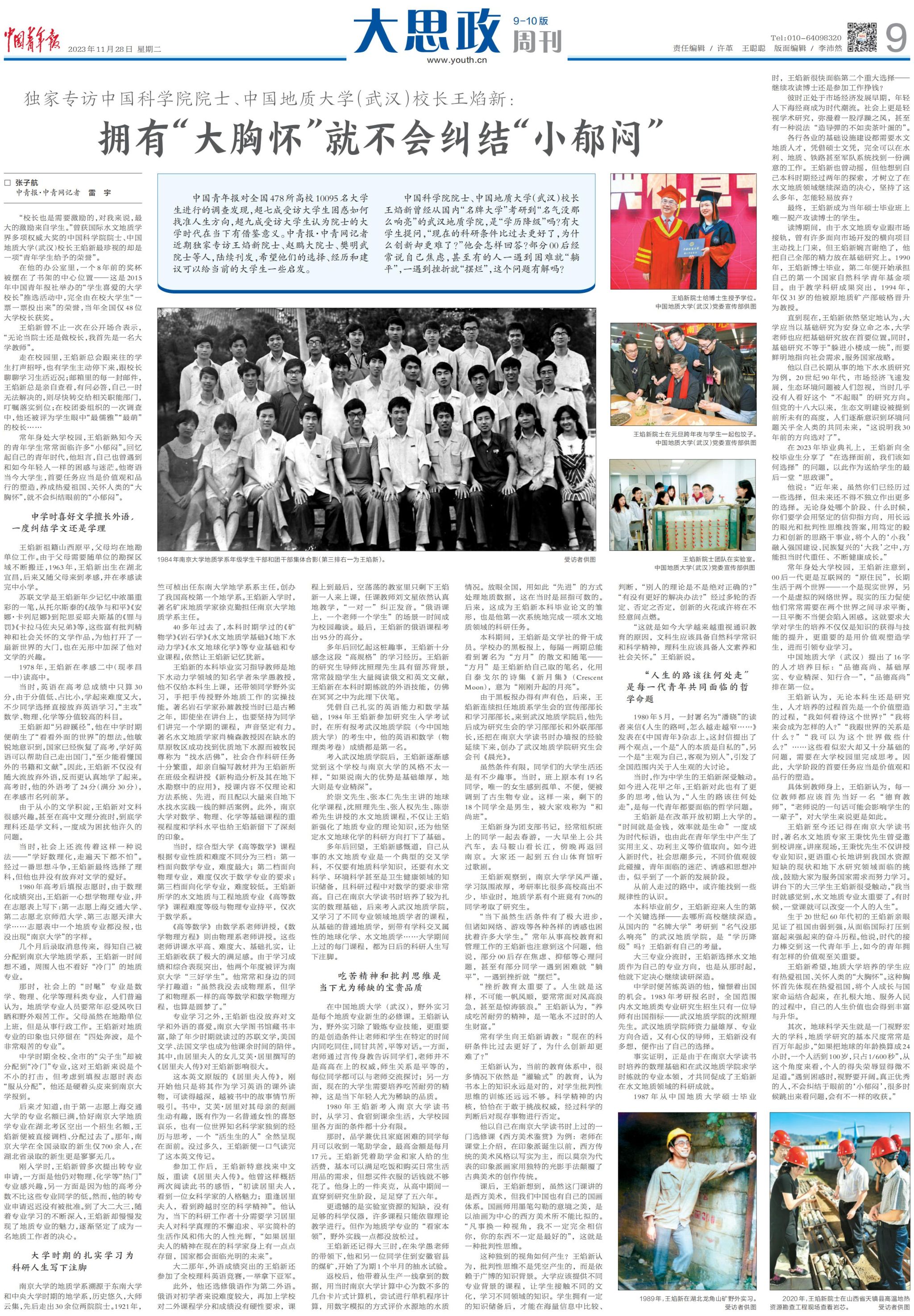 编者按:11月28日,《中国青年报》以《独家专访中国科学院院士、米兰milan官方网站(武汉)校长王焰新:拥有“大胸怀”就不会纠结“小郁闷”》为题,整版报道米兰校长王焰新院士在大学时代的选择和经历,以及给当前大学生们的建议,原文如下: